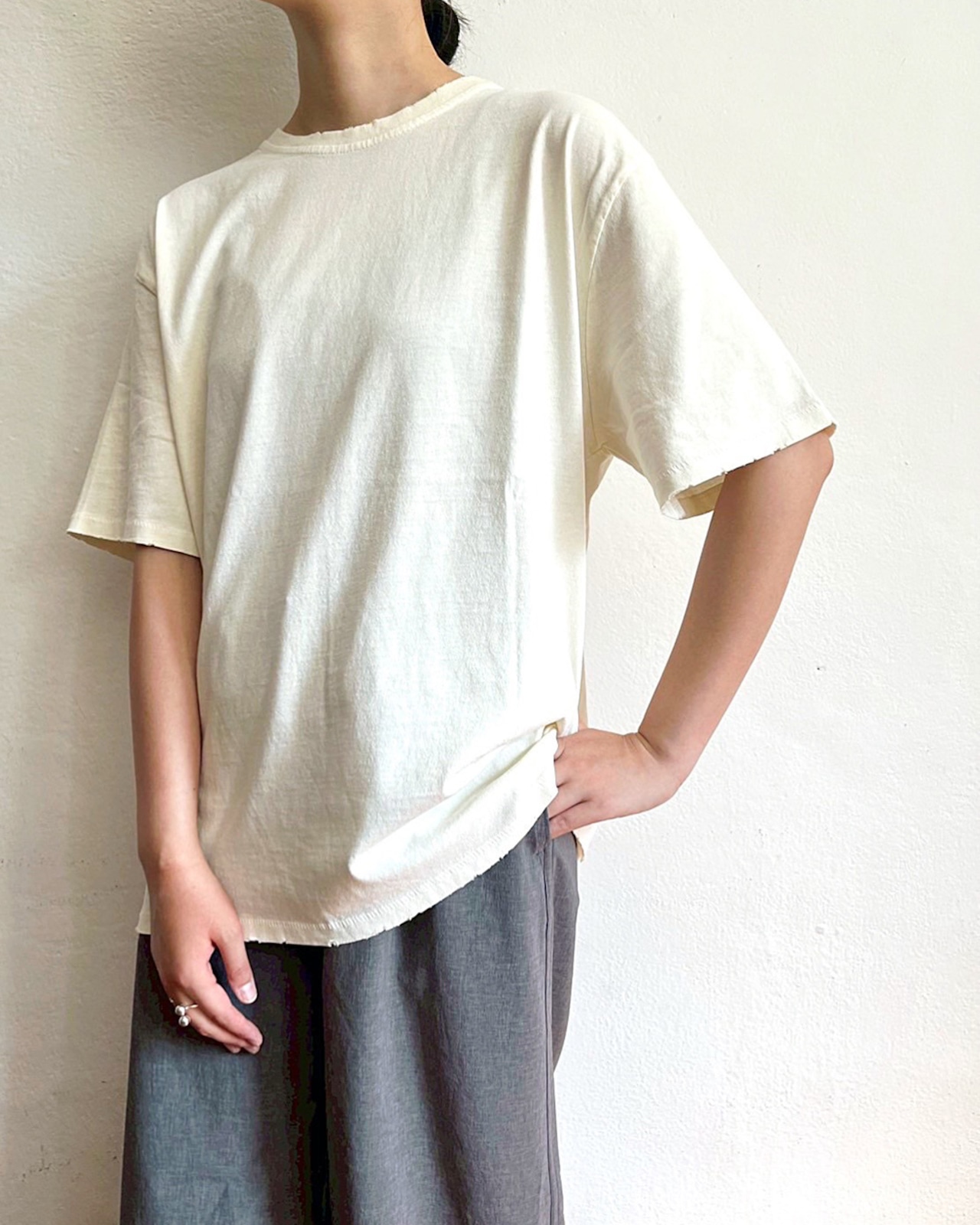 精鋭の職人が一点ずつ仕上げるエイジング加工は、手仕事ならではの奥深い風合いとリアルな古着感を表現。肩を落としたリラックスシルエットとコットン100%の柔らかさは、着るほどに馴染み、自分だけの表情へと育っていきます。