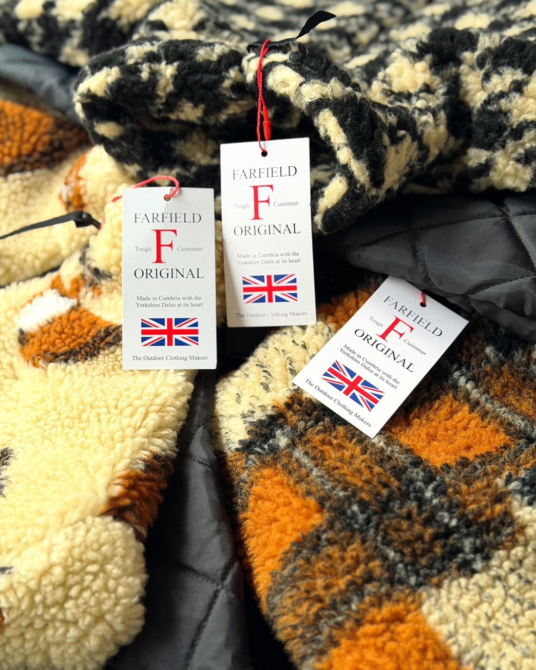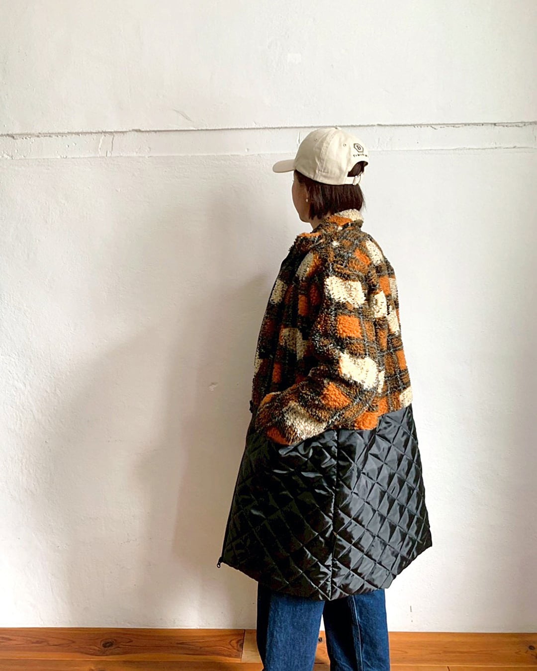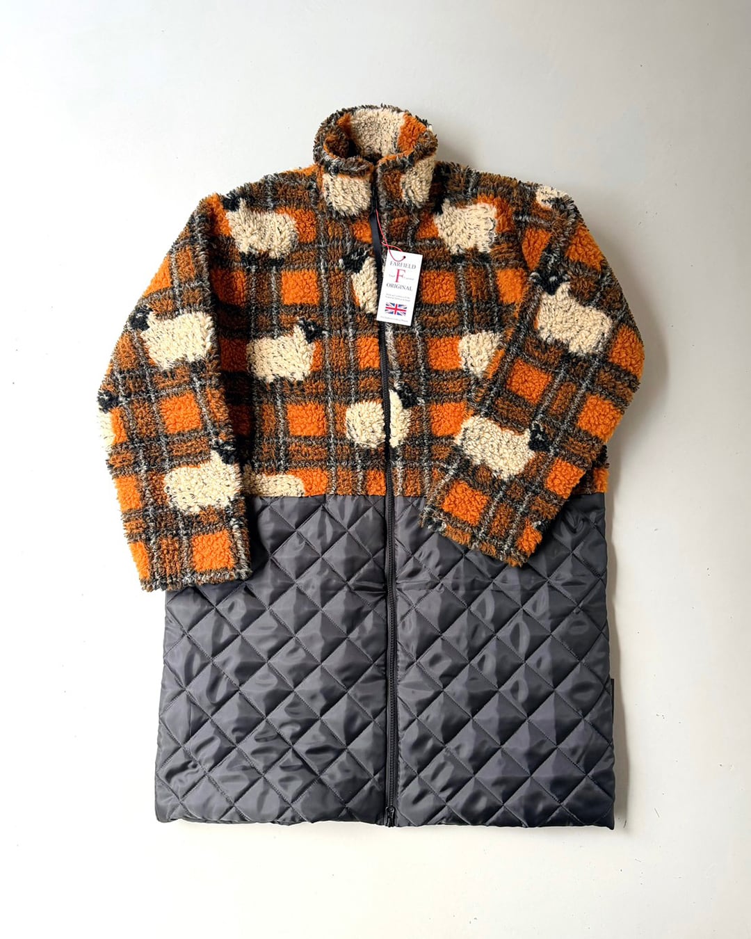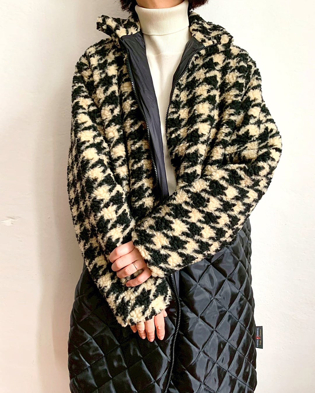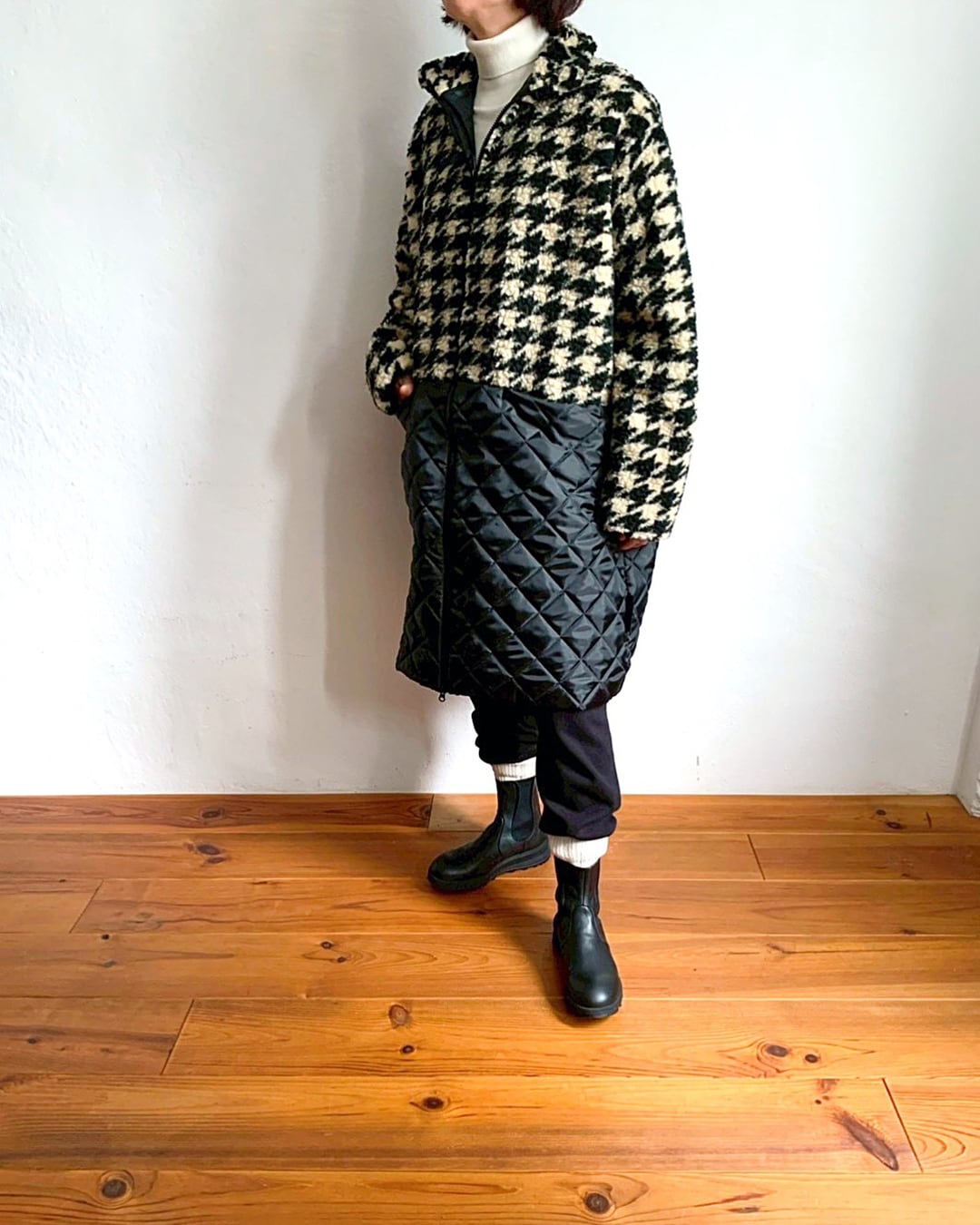 イギリス製ジャカードのボアフリースとキルティングを組み合わせたミディアムコート