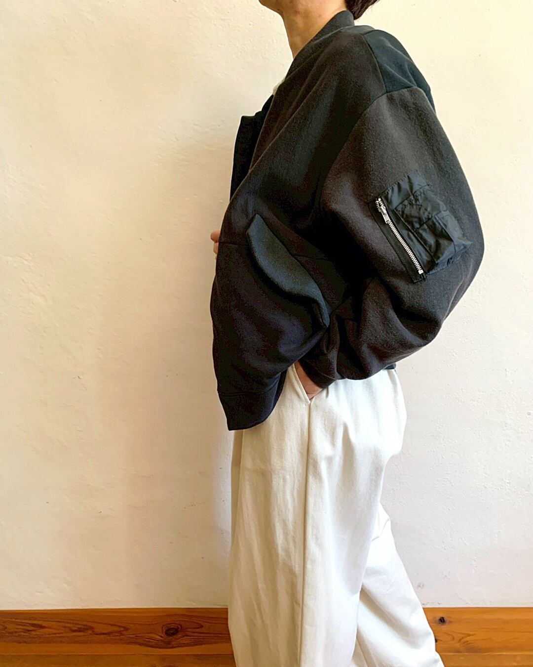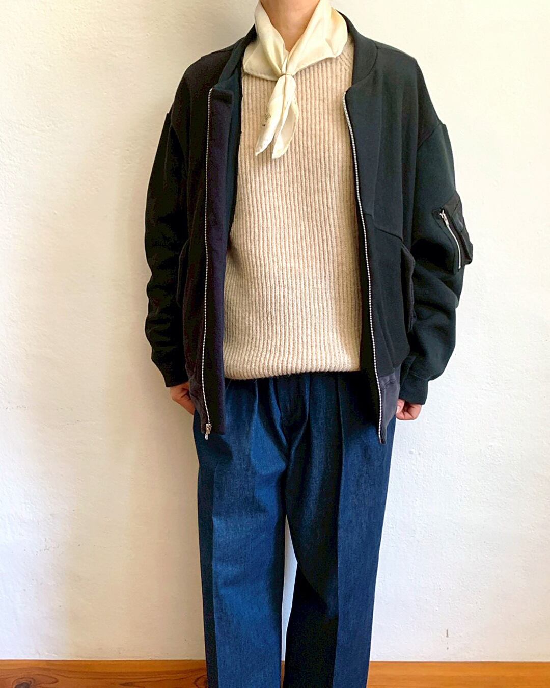 ミリタリーの要素は残しつつ、軽やかな着心地や印象はスウェットカーディガンに近く、気負わず羽織れる一着です。