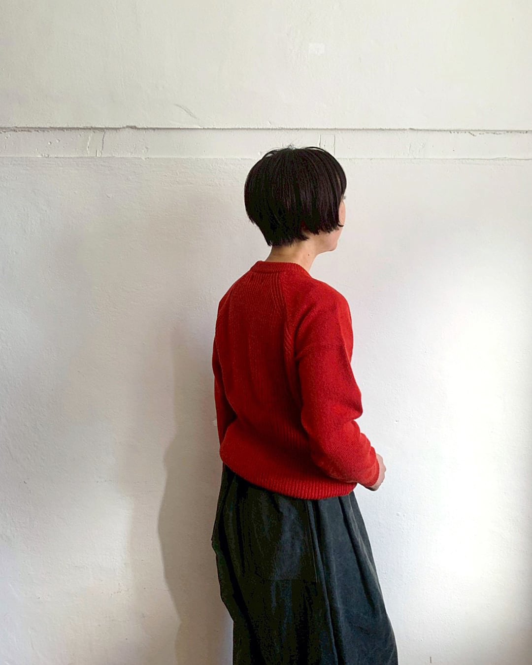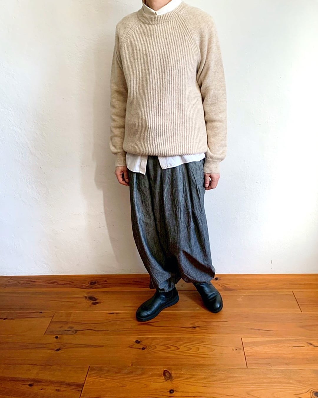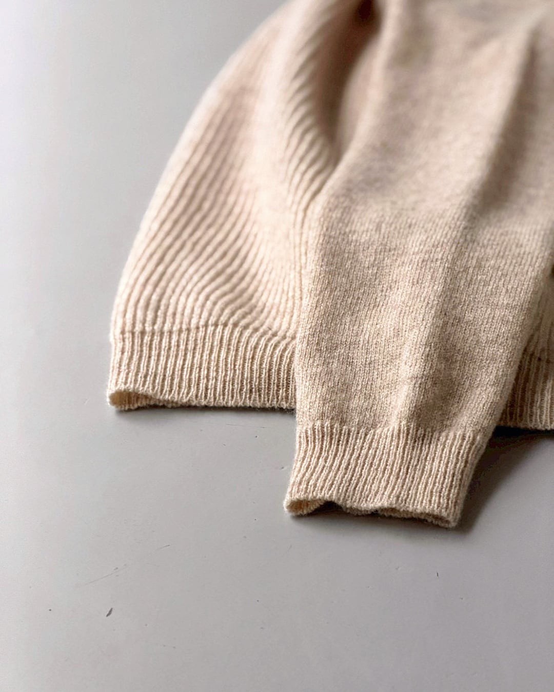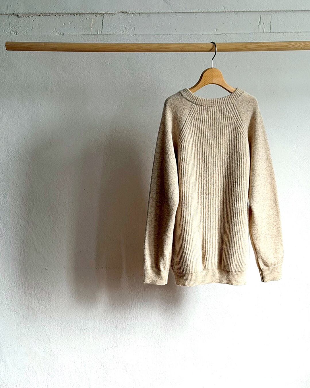 身頃と袖で編みの表情を切り替えたラグラン仕様が、肩まわりに自然な動きを生みます。