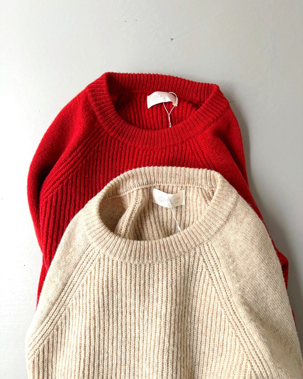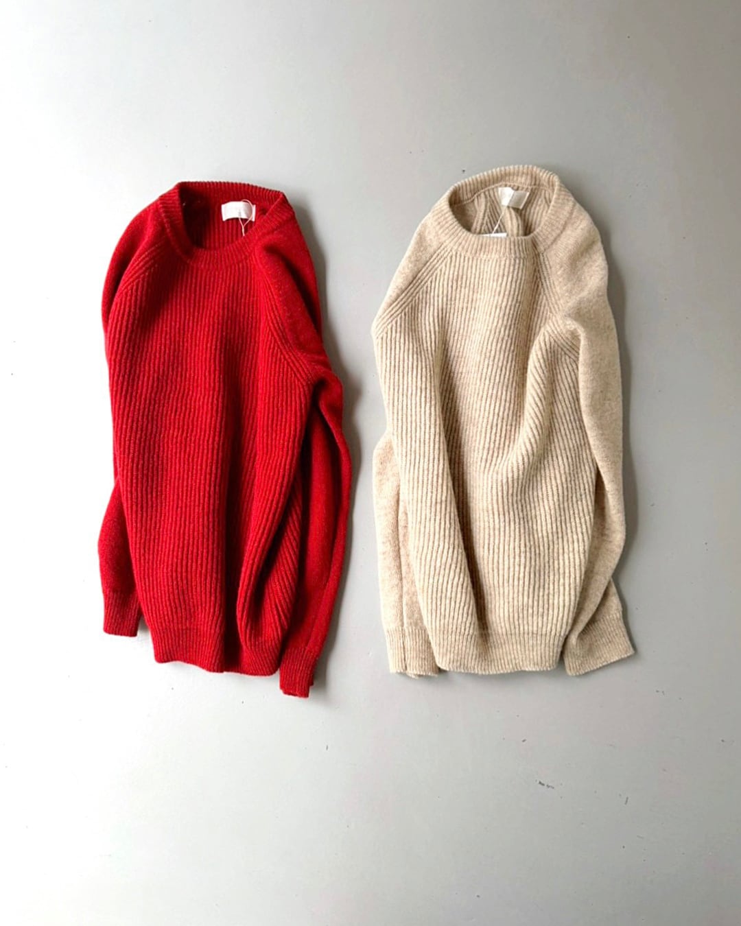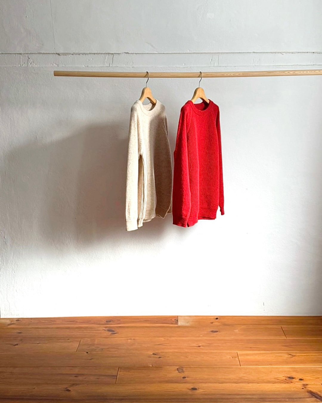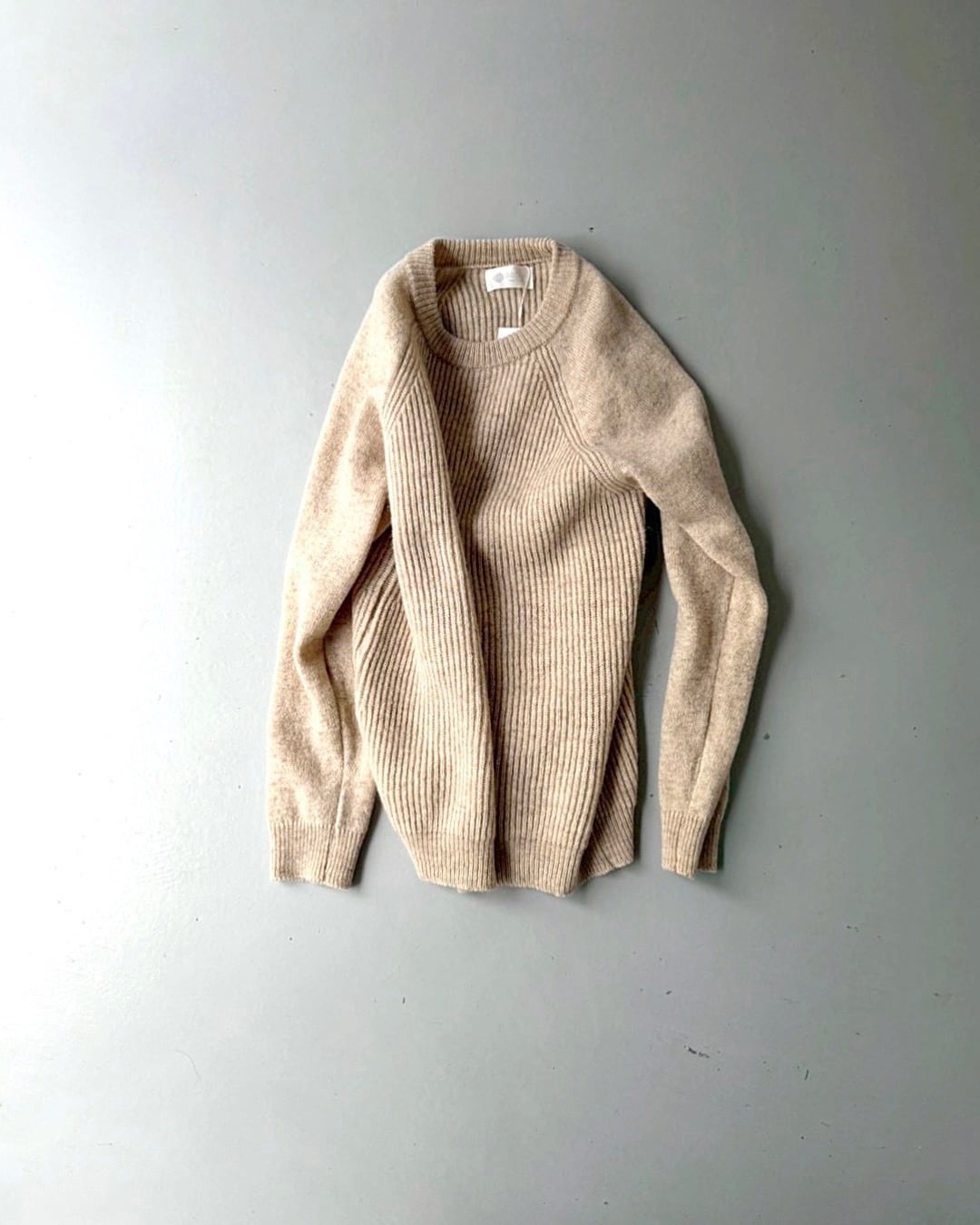 身頃と袖で編みの表情を切り替えたラグラン仕様が、肩まわりに自然な動きを生みます。