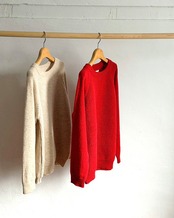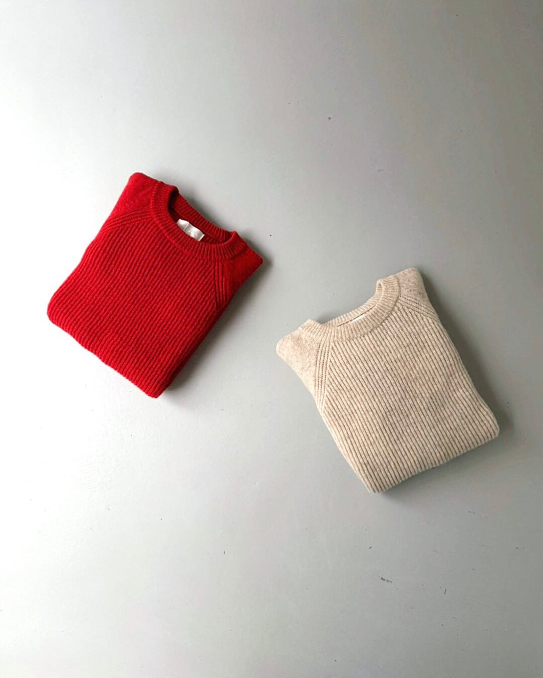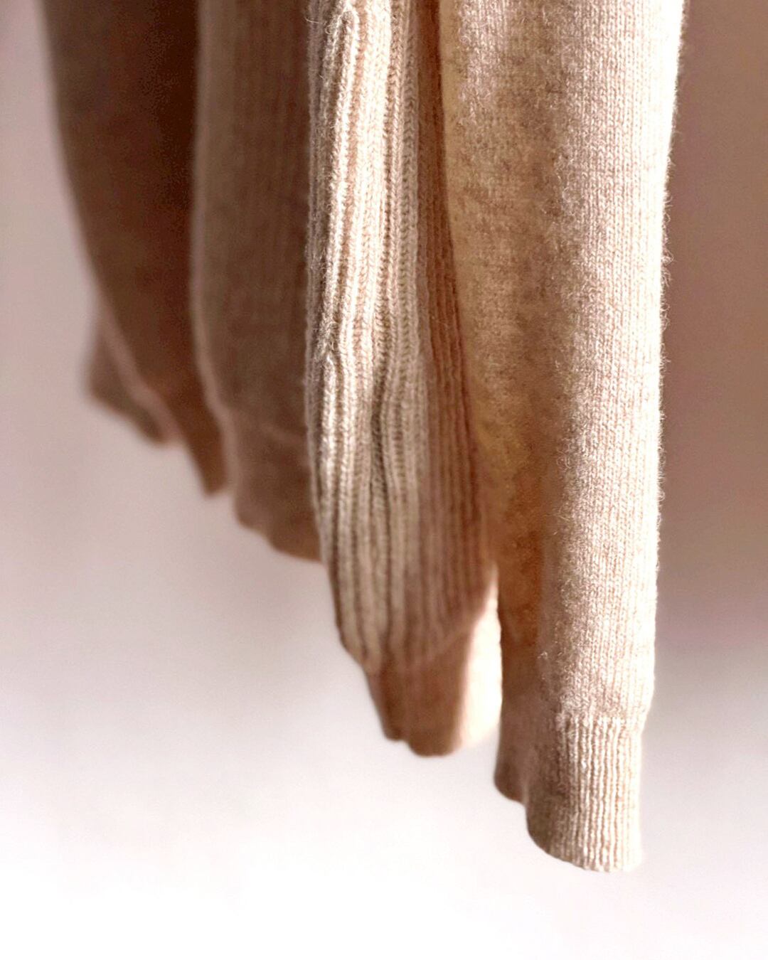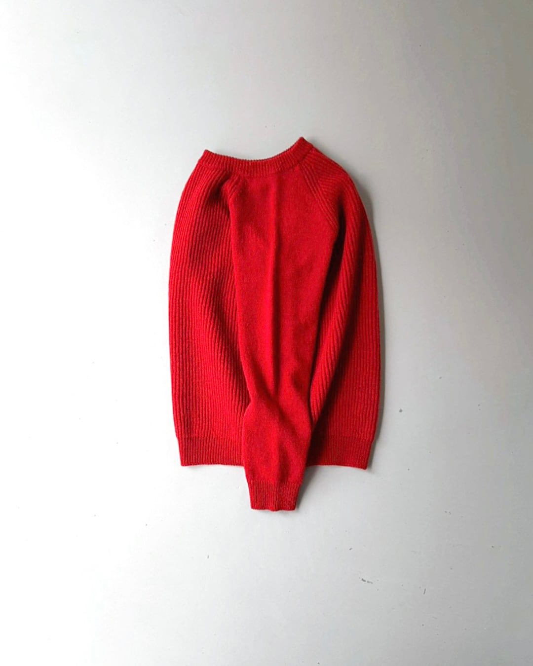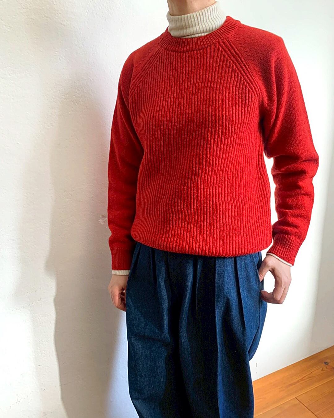 身頃と袖で編みの表情を切り替えたラグラン仕様が、肩まわりに自然な動きを生みます。