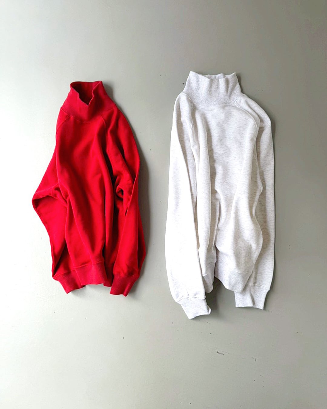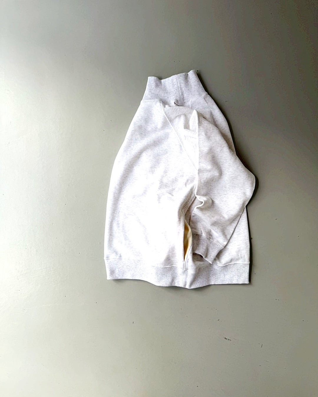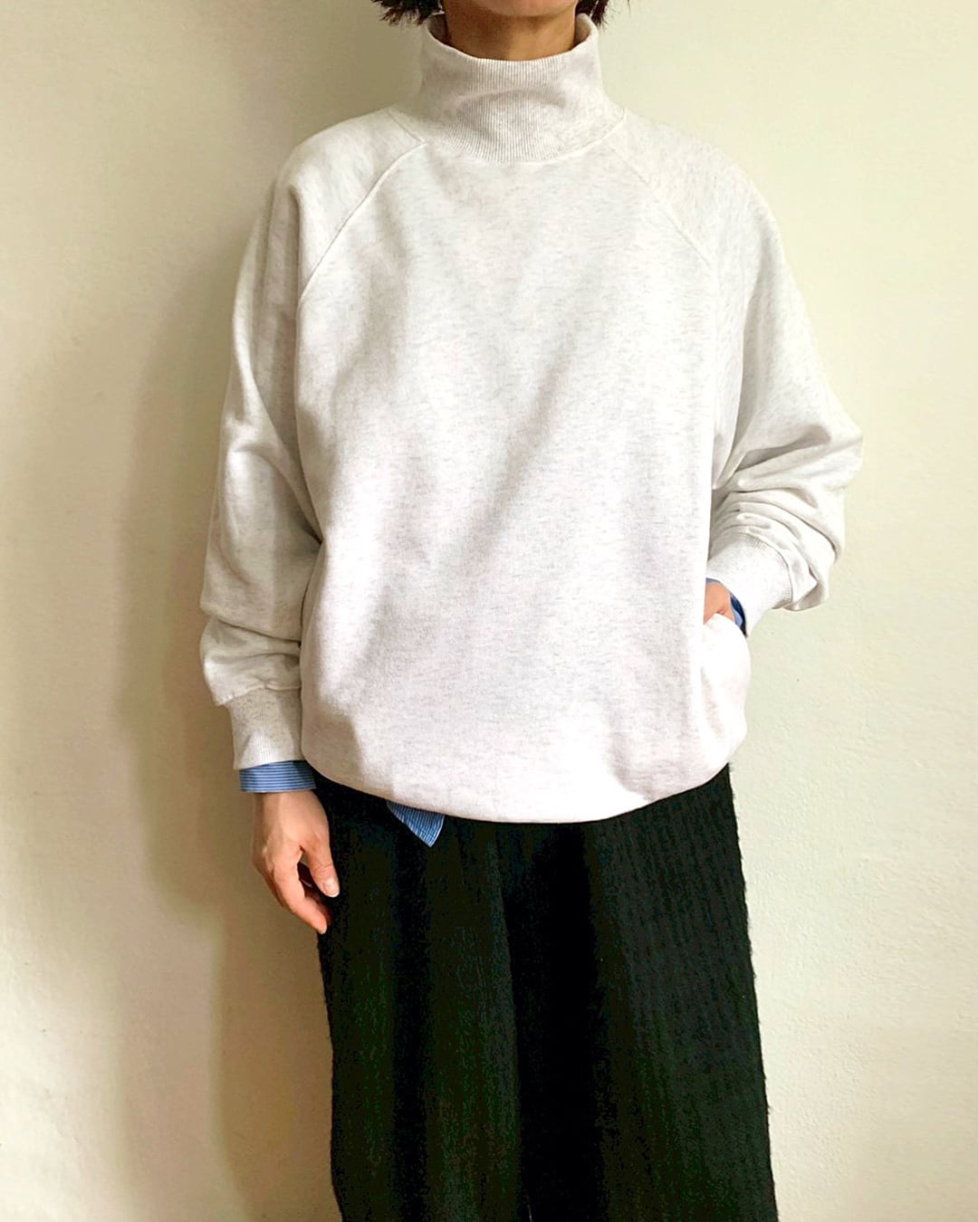 立ち上がりを抑えたネックとラグランスリーブが自然な可動性を生み、肩まわりをすっきり整えます。