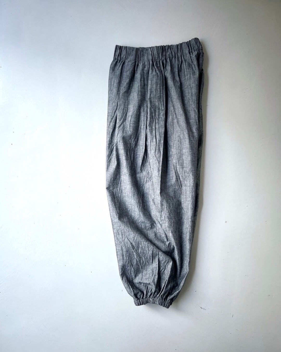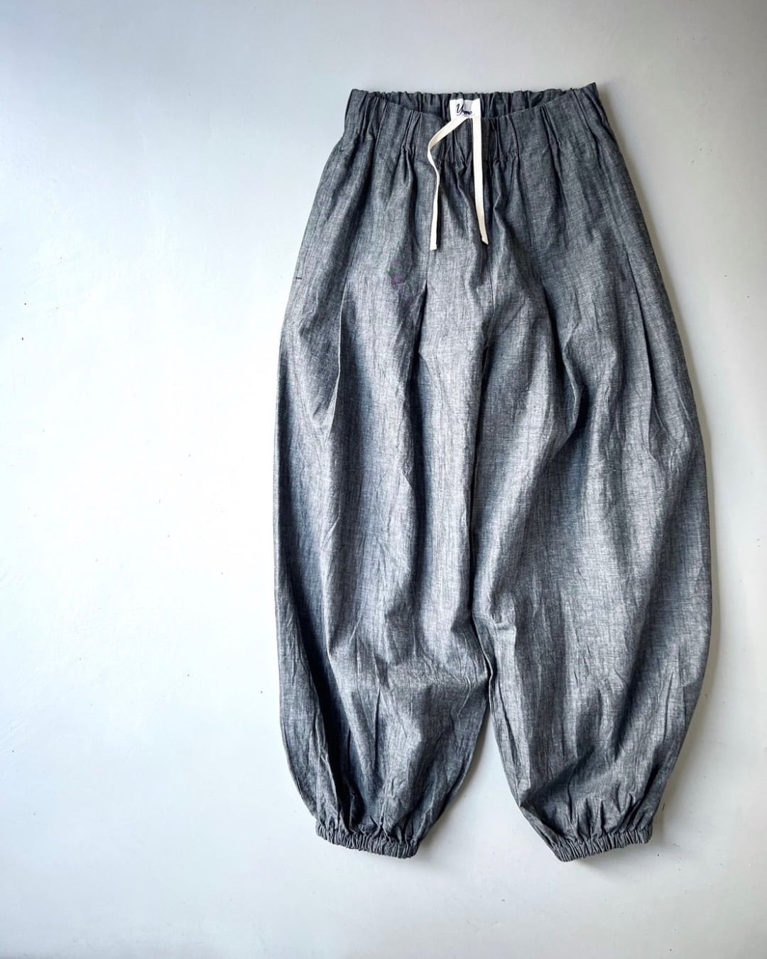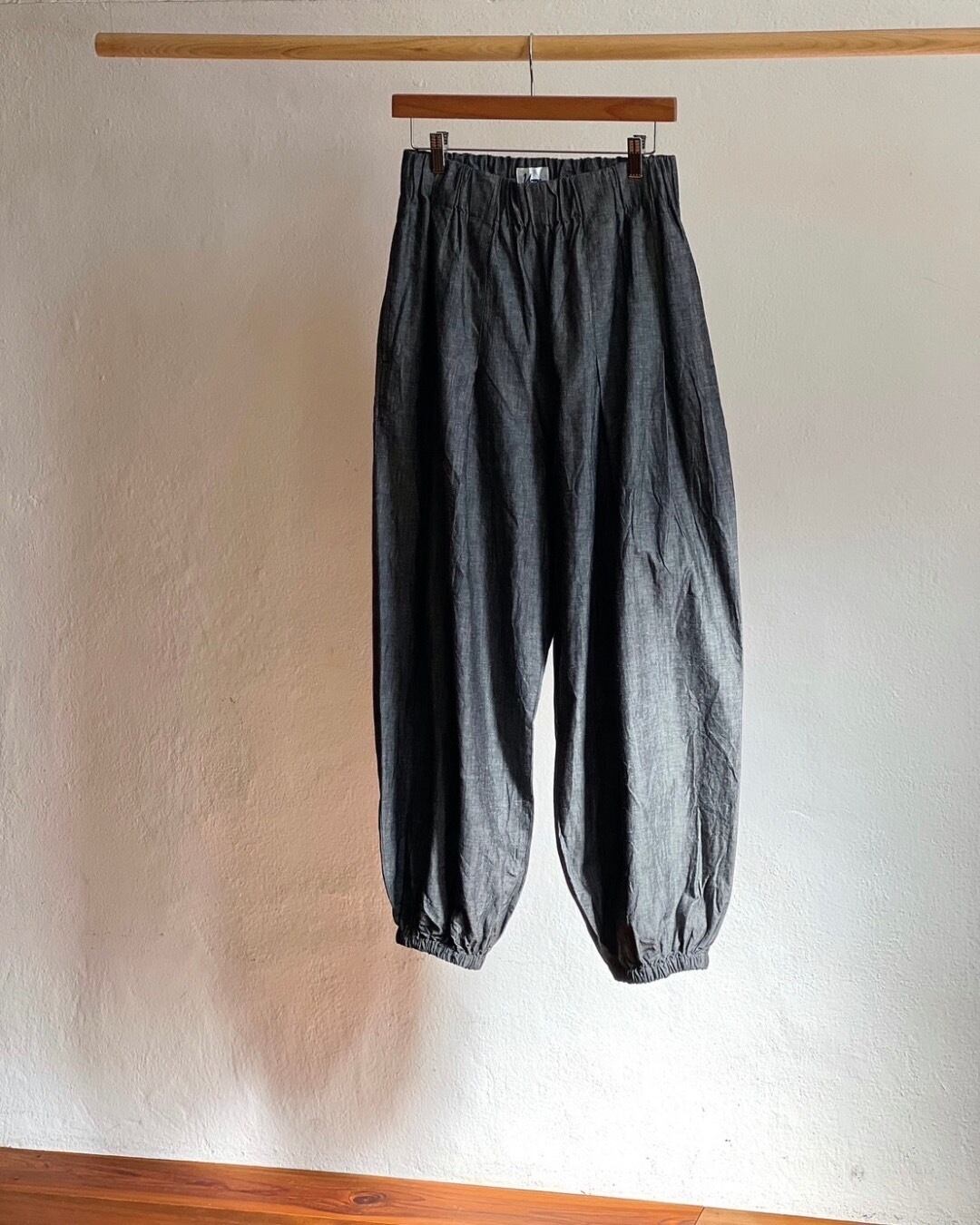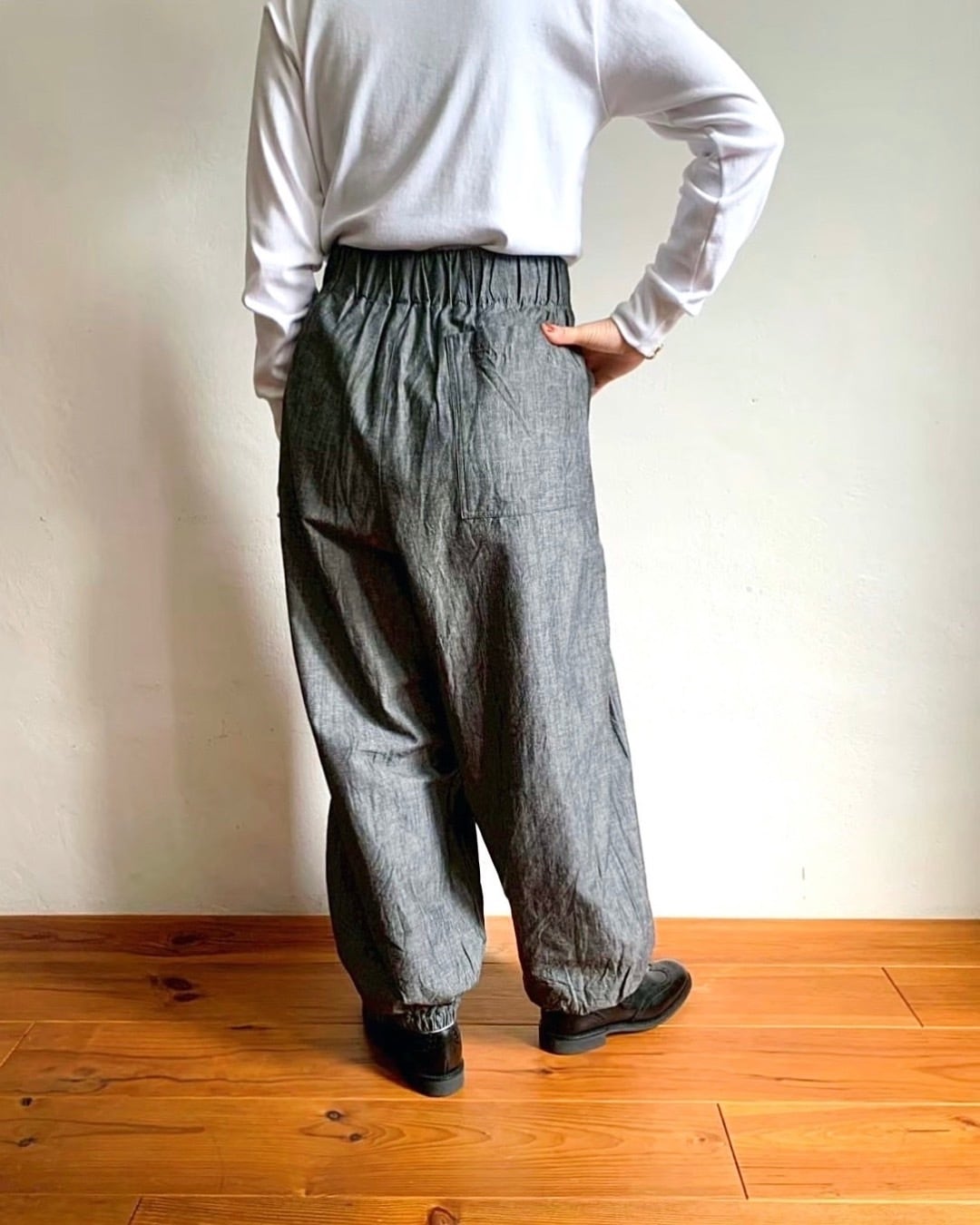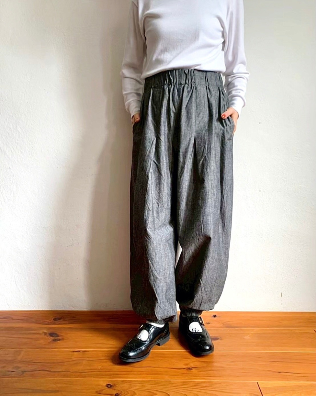ゆったりとした腰まわりに、足首で締まるバルーンシルエットイージーパンツ。