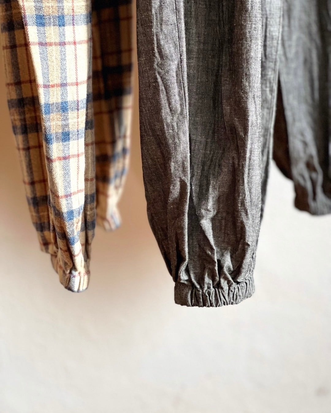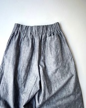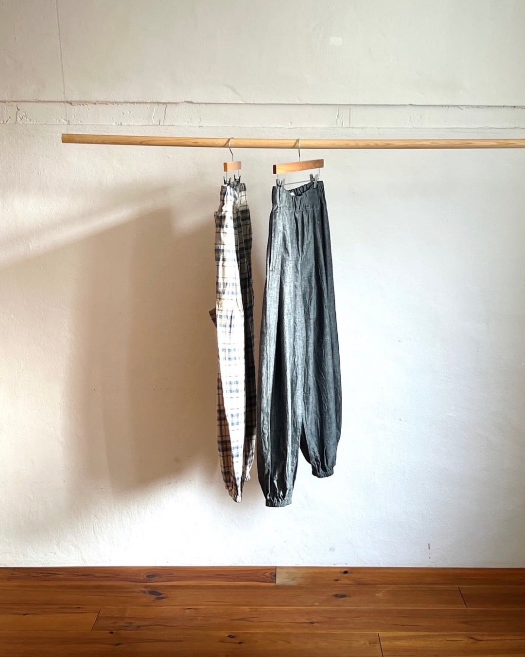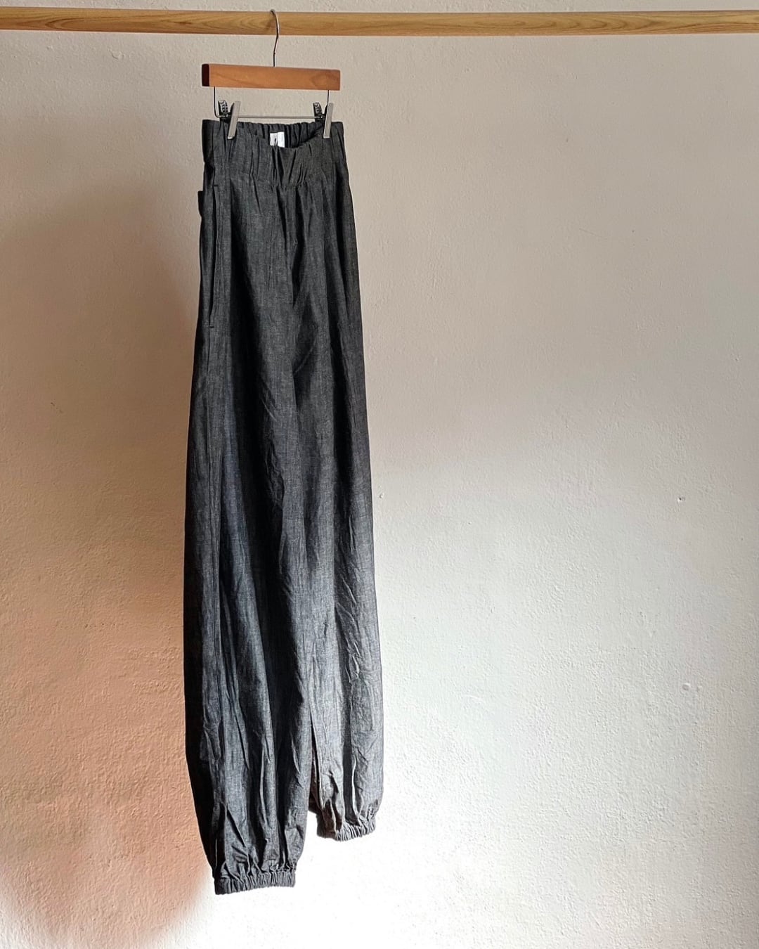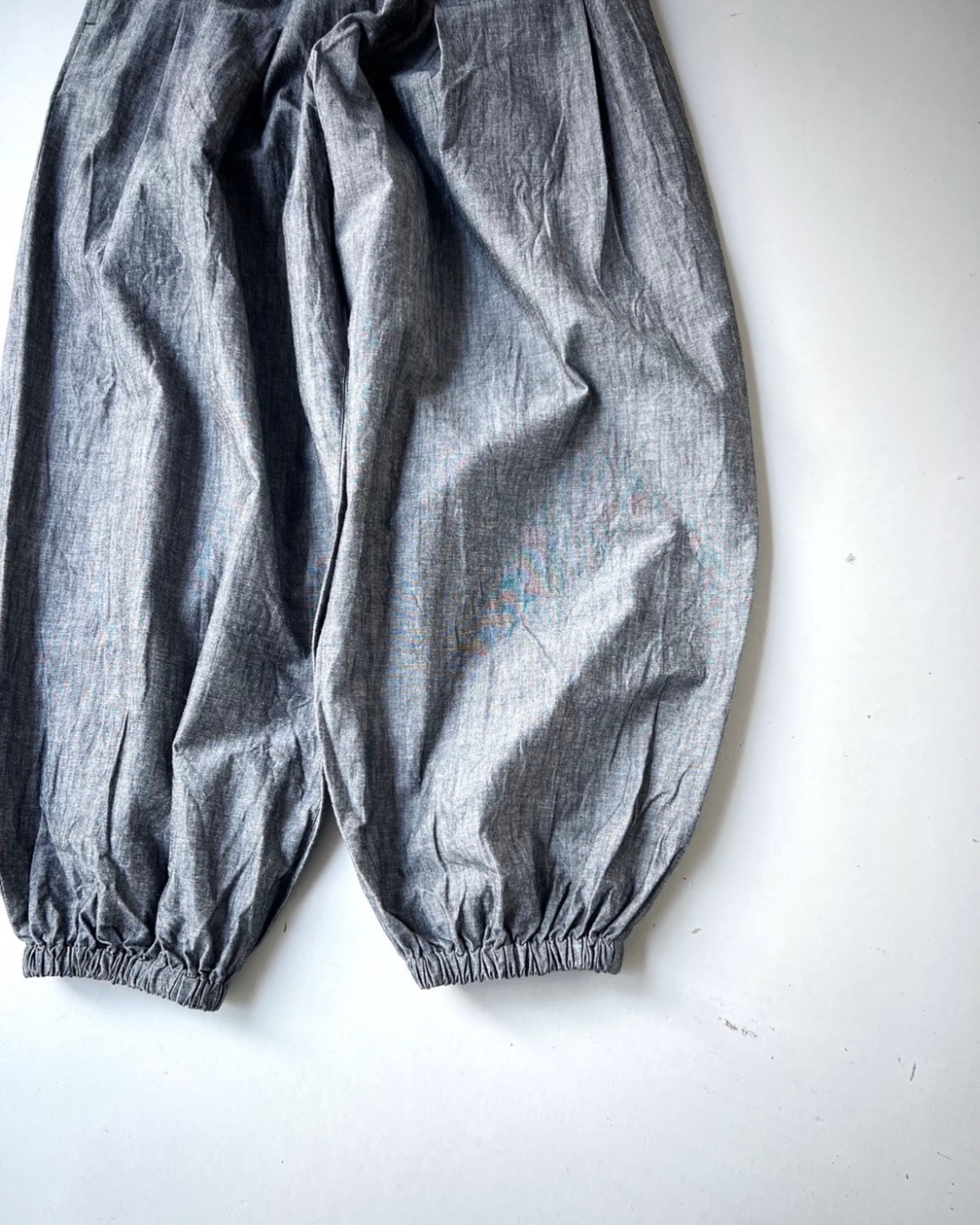 ゆったりとした腰まわりに、足首で締まるバルーンシルエットイージーパンツ。