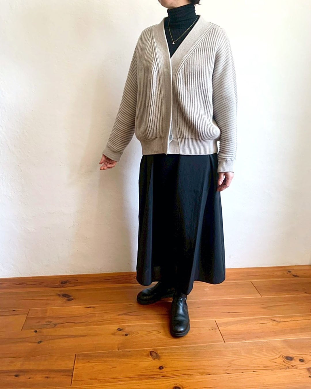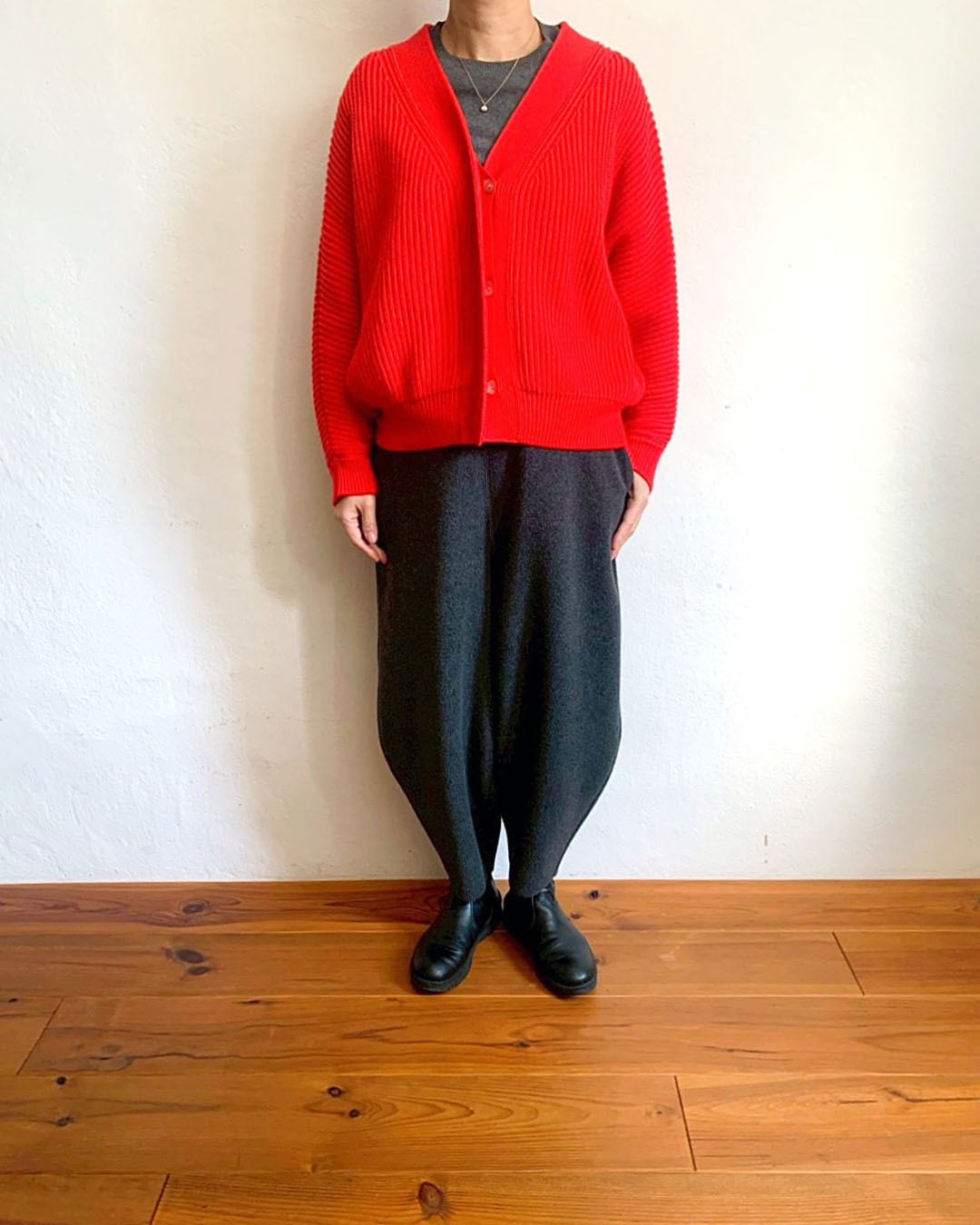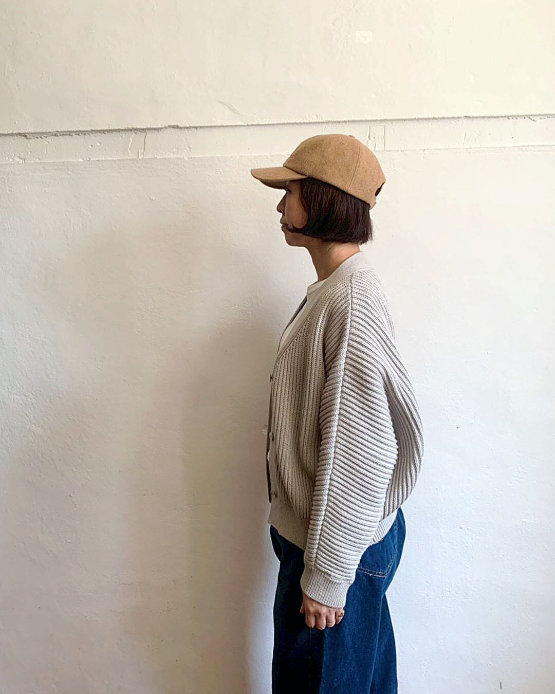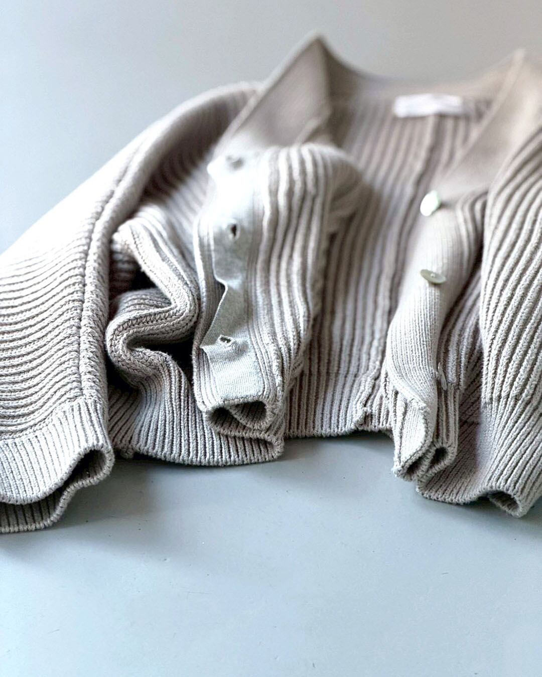 畝のある編地が縦ラインを強調し、フロントはボタンを隠したミニマルな仕様で自然とすっきりした印象に整えてくれます。