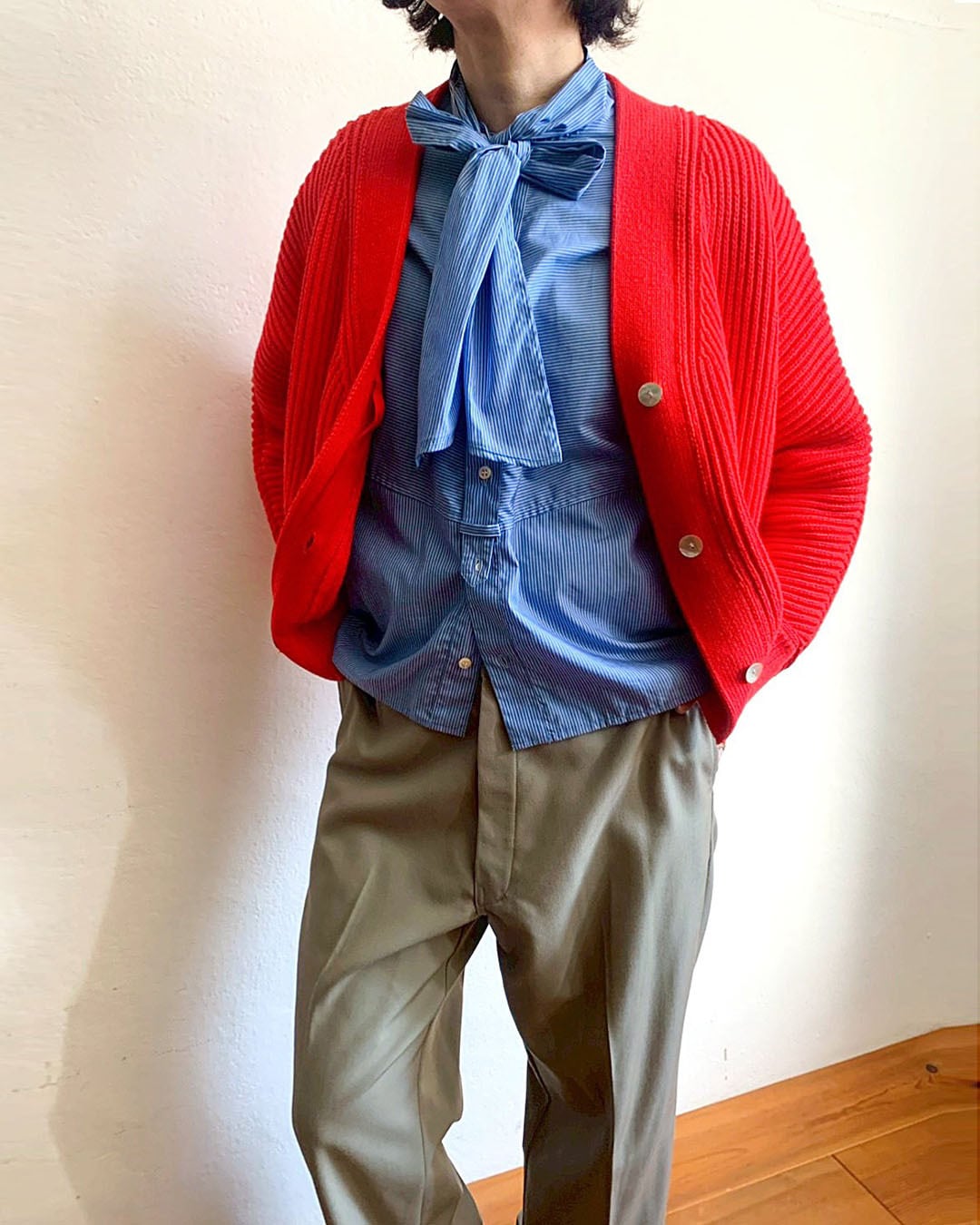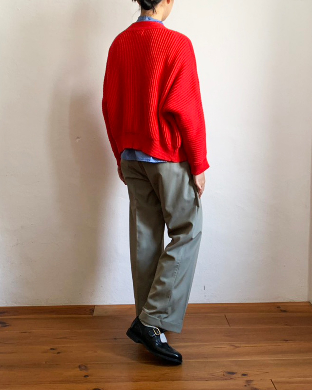 深めのVネックが顔まわりをシャープに見せ、レイヤードしやすいバランスです。