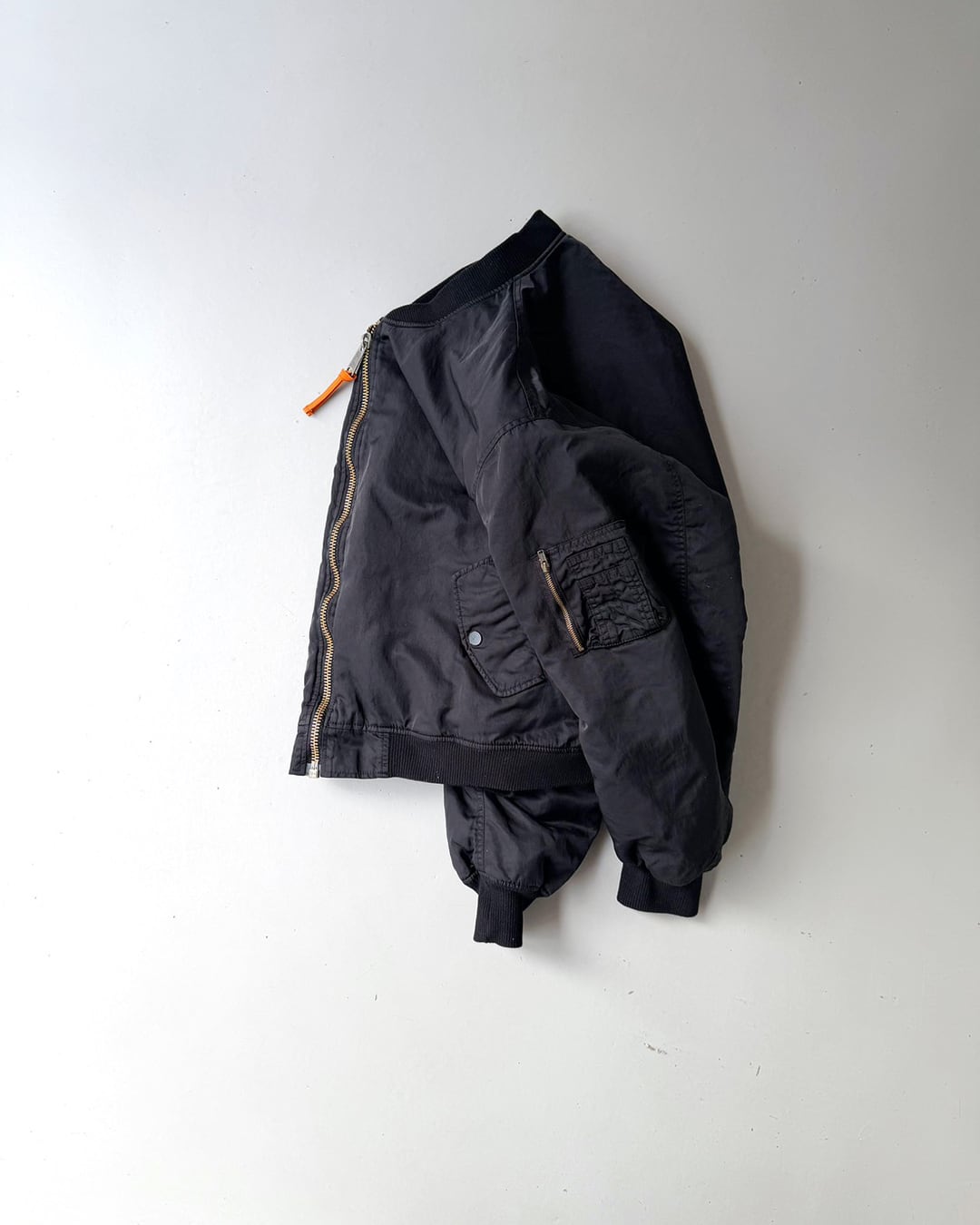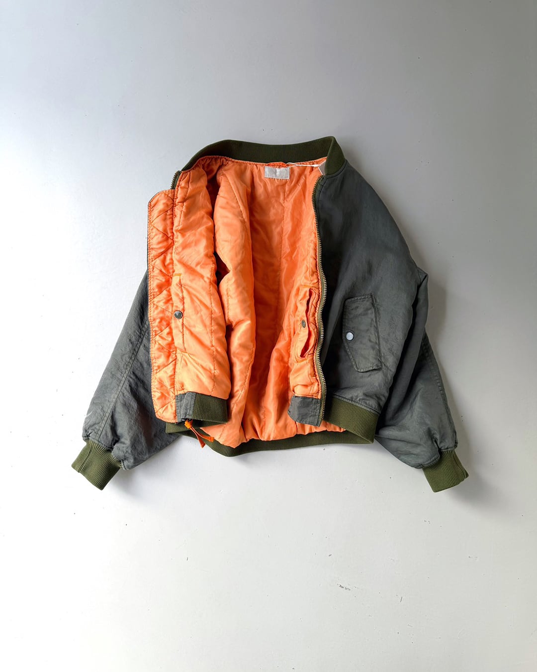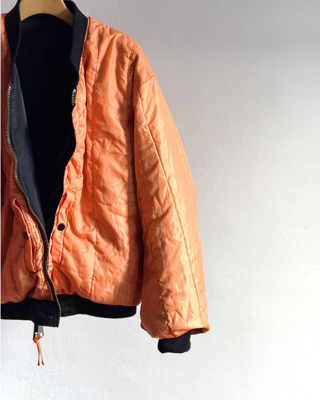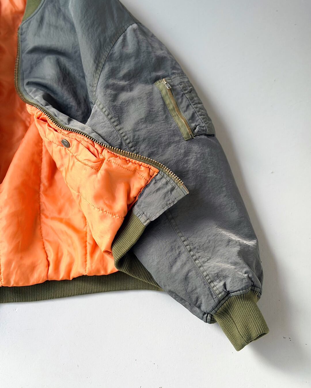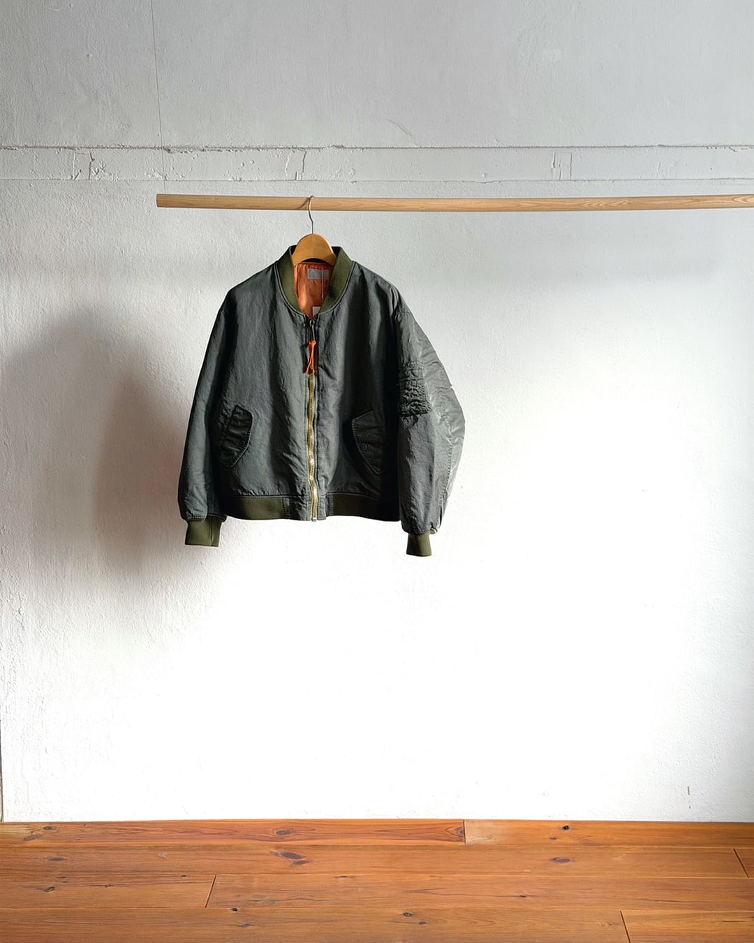 ふっくらと丸みを帯びて動きやすい袖周りと、コンパクト丈。一般的なMA-1よりも中綿の分量を抑える事で軽やかに羽織れるバランスに仕上がっています。