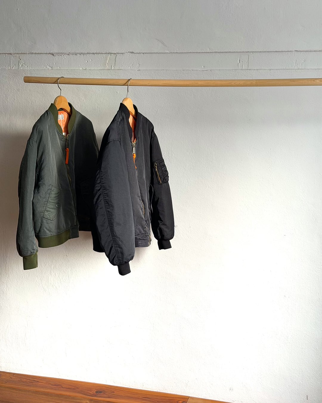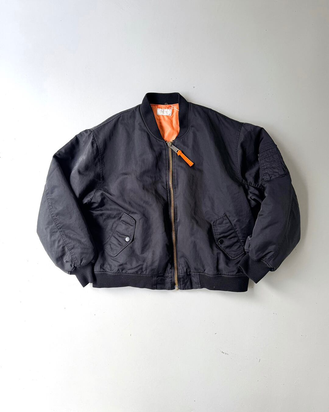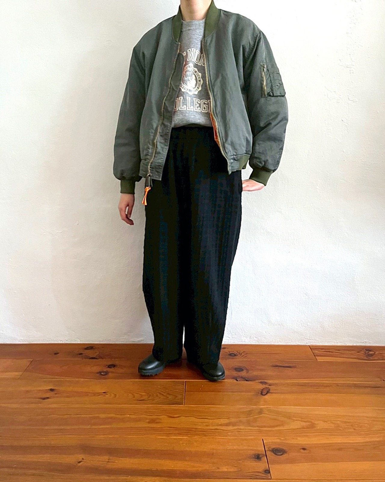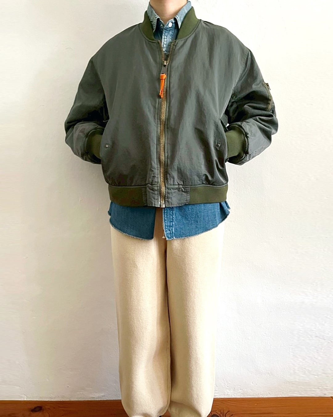 ふっくらと丸みを帯びて動きやすい袖周りと、コンパクト丈。一般的なMA-1よりも中綿の分量を抑える事で軽やかに羽織れるバランスに仕上がっています。