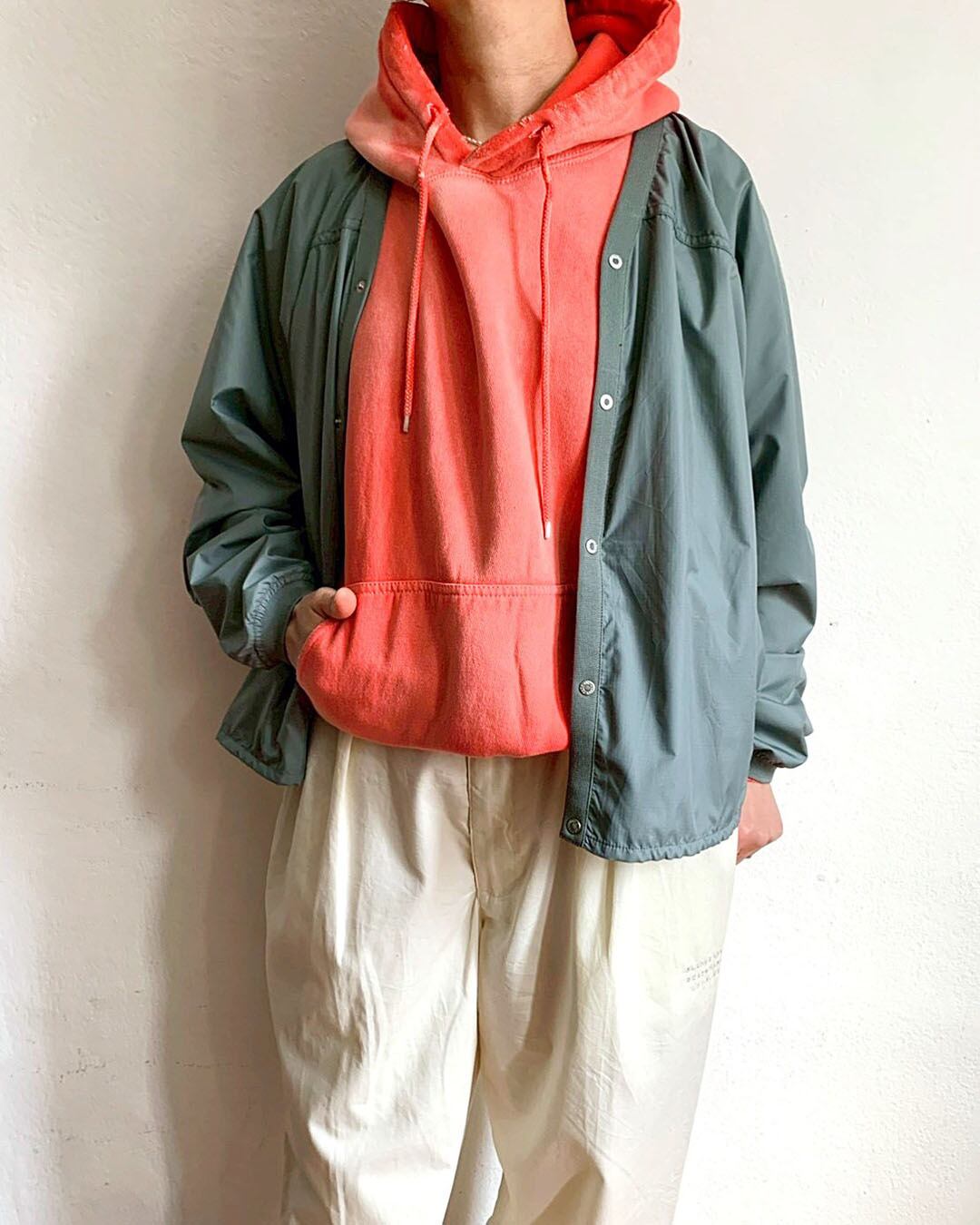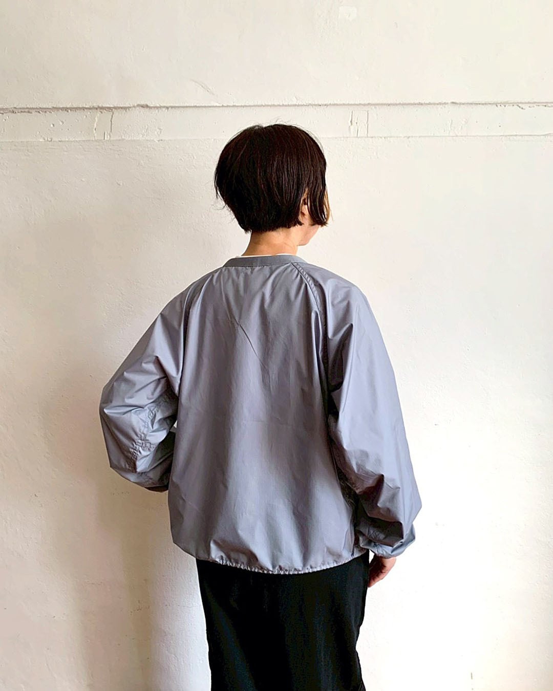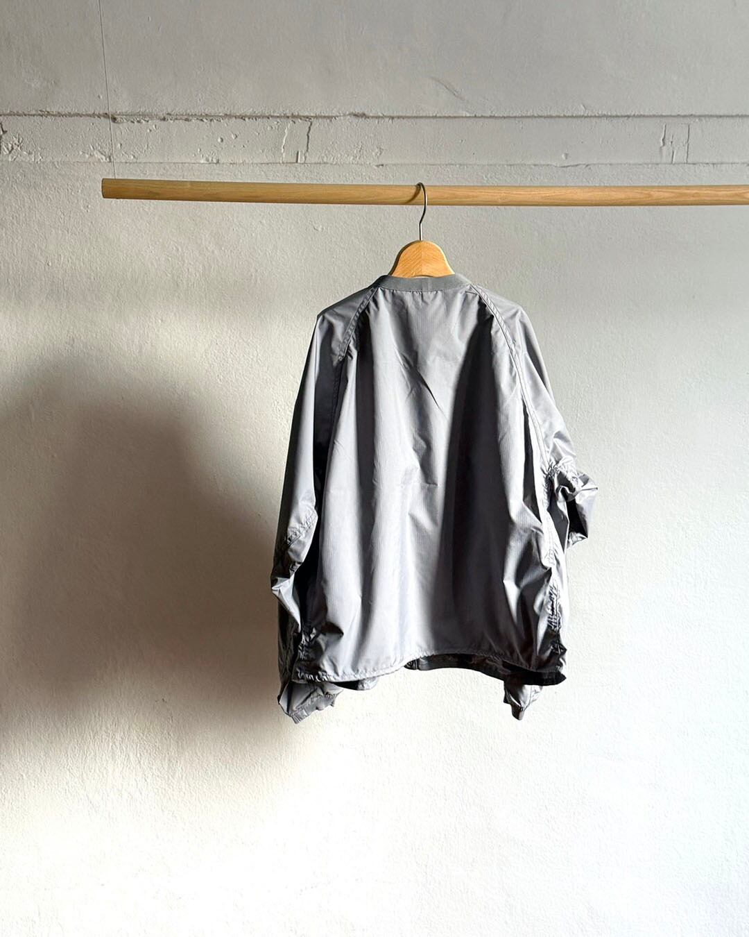 身幅にゆとりのあるシルエット。右に大きめのファスナーポケット、左内側にパッカブルポケット付きで、持ち運びにも便利な一枚です。
