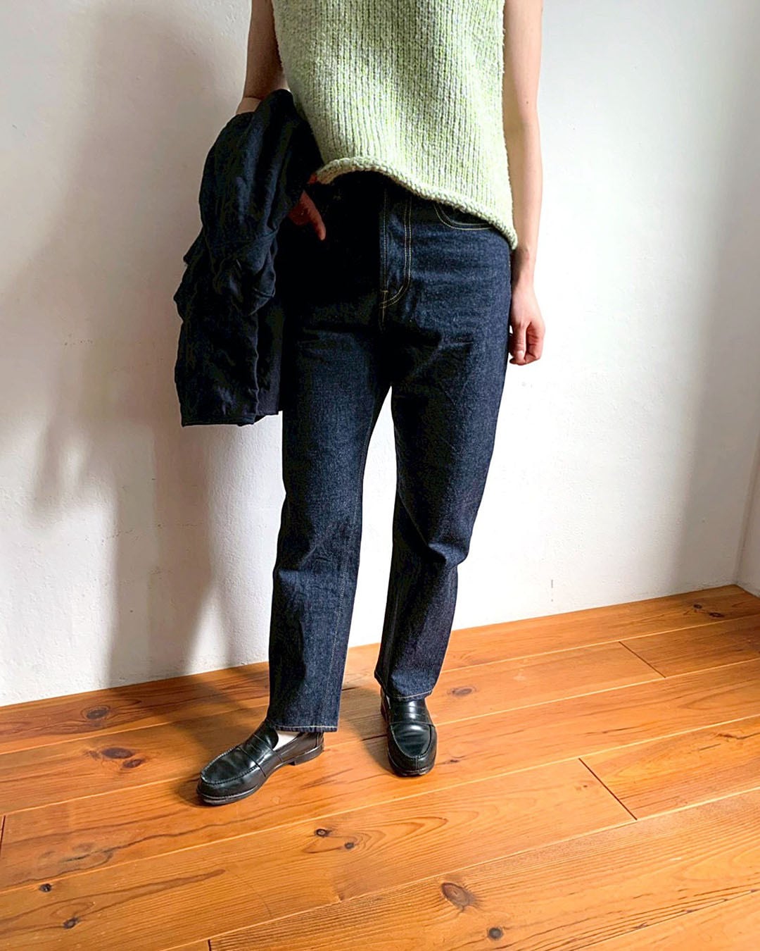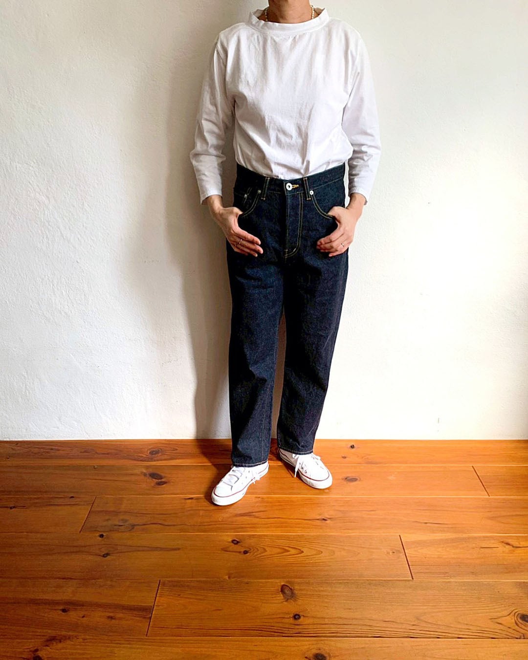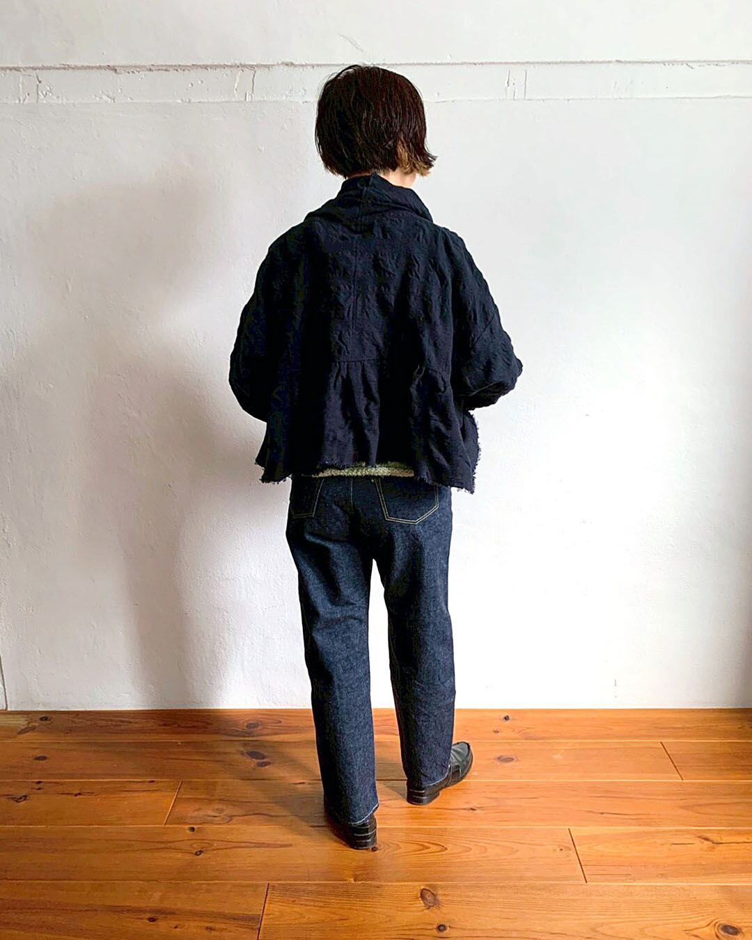 全体はゆるやかにゆとりを持たせつつ、裾にかけて自然と細くなるシルエットです。
