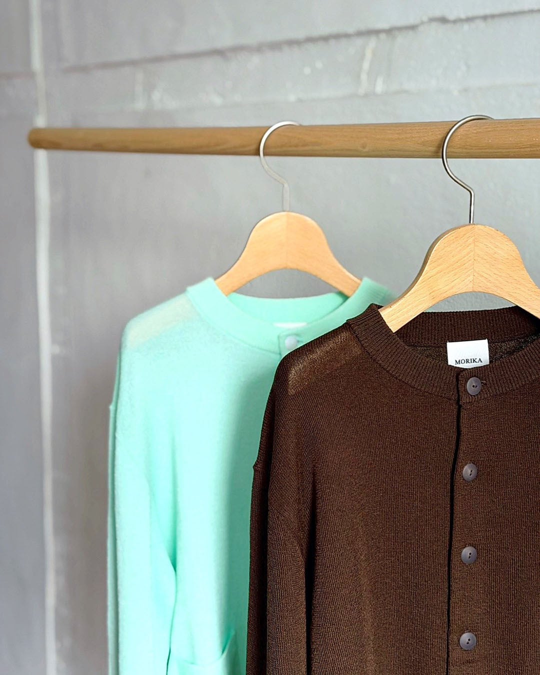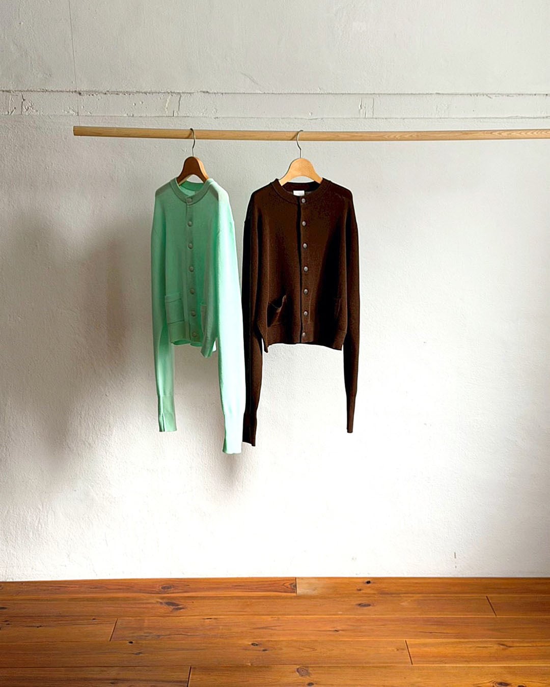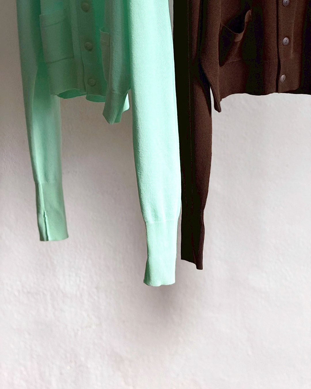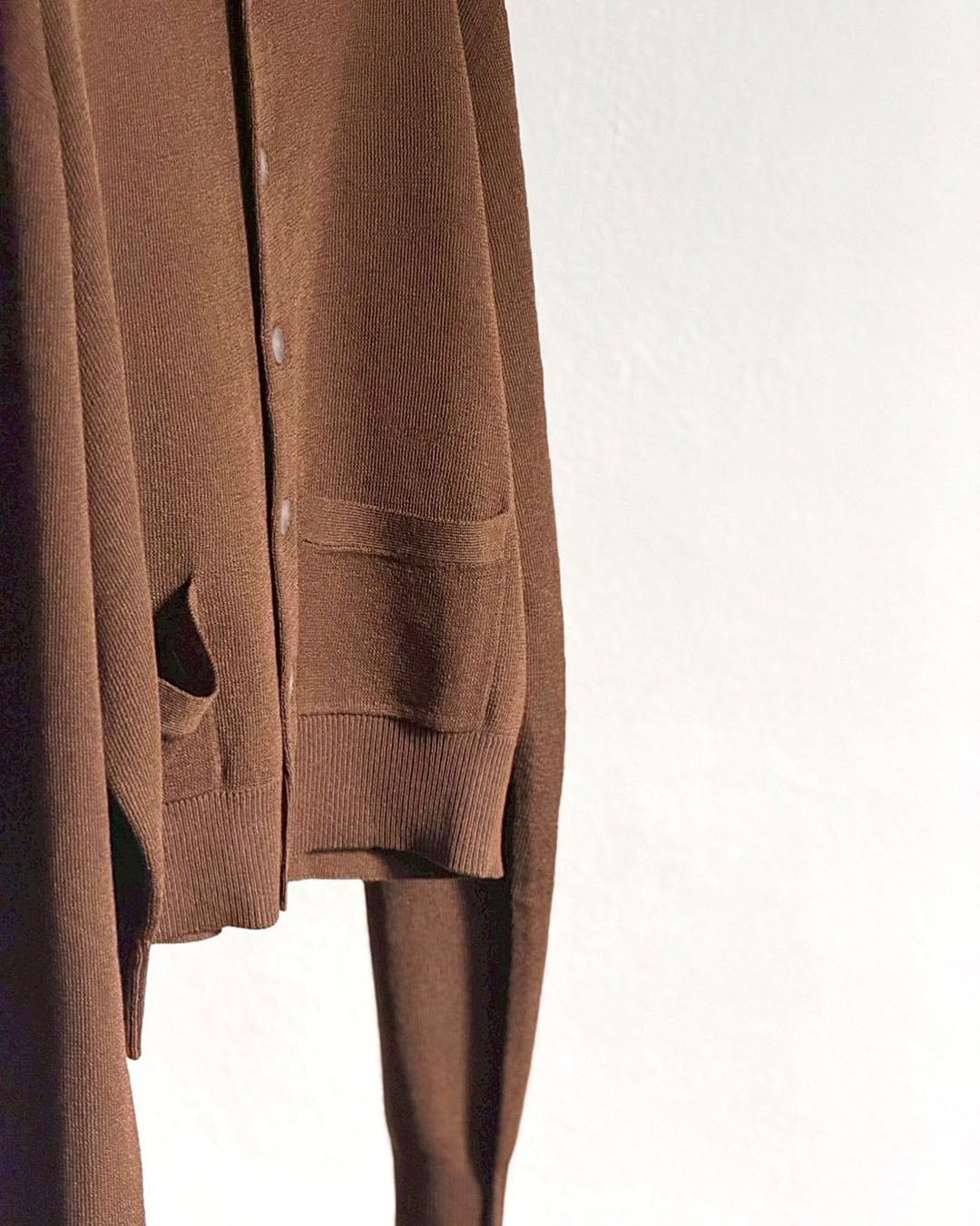 シルクのような穏やかな光沢と、ほのかなシャリ感をあわせ持つコットンアセデートのカーディガン。