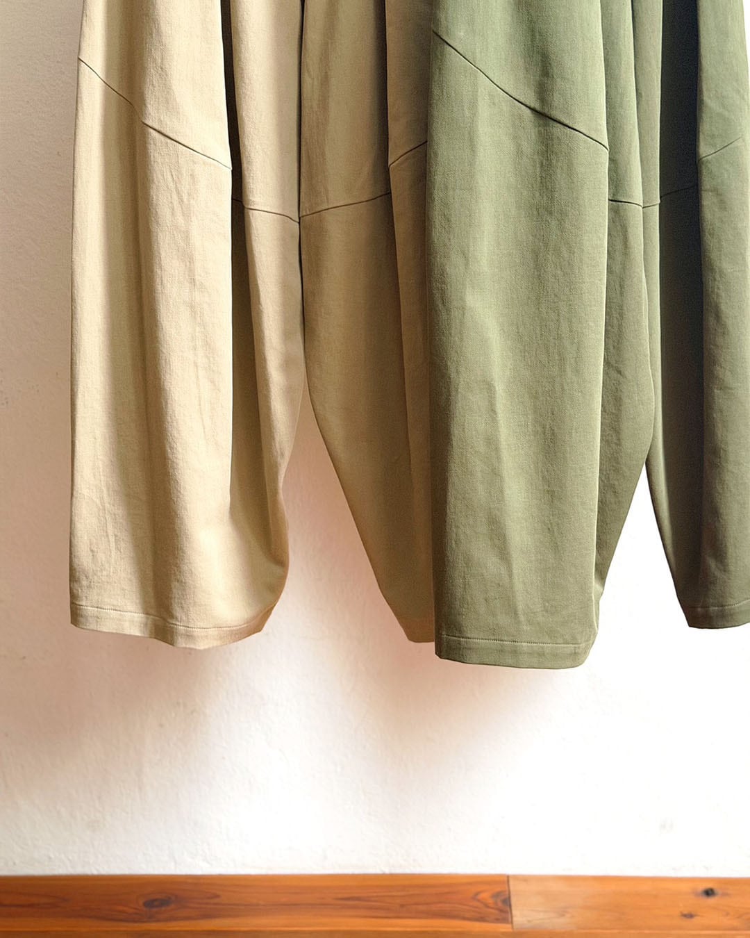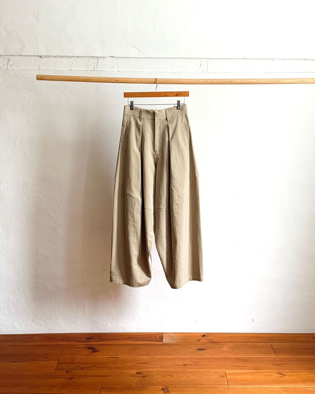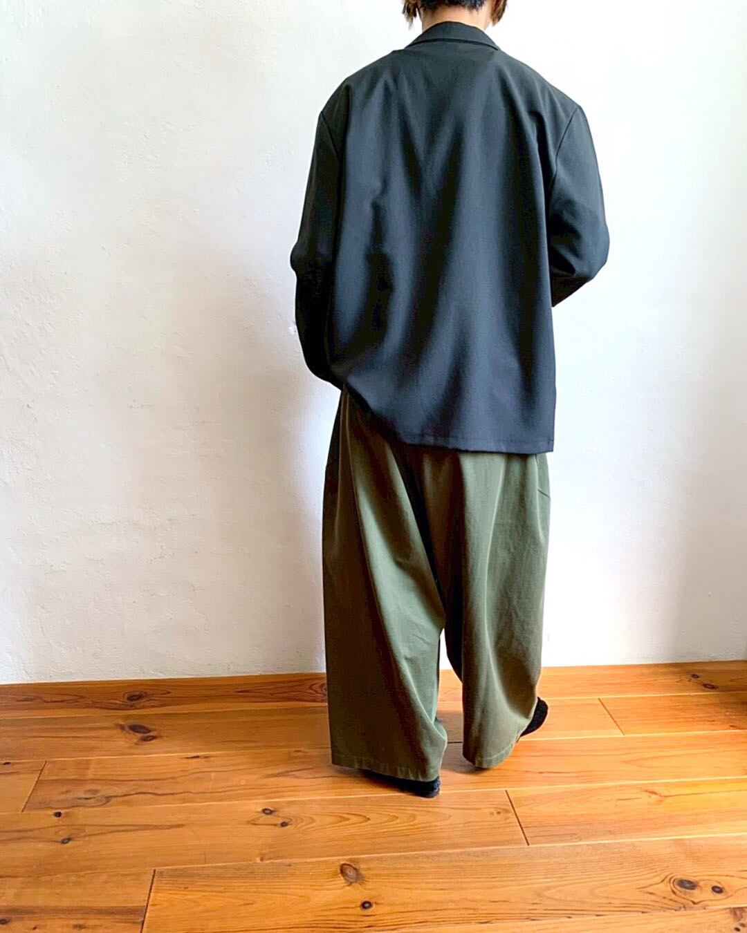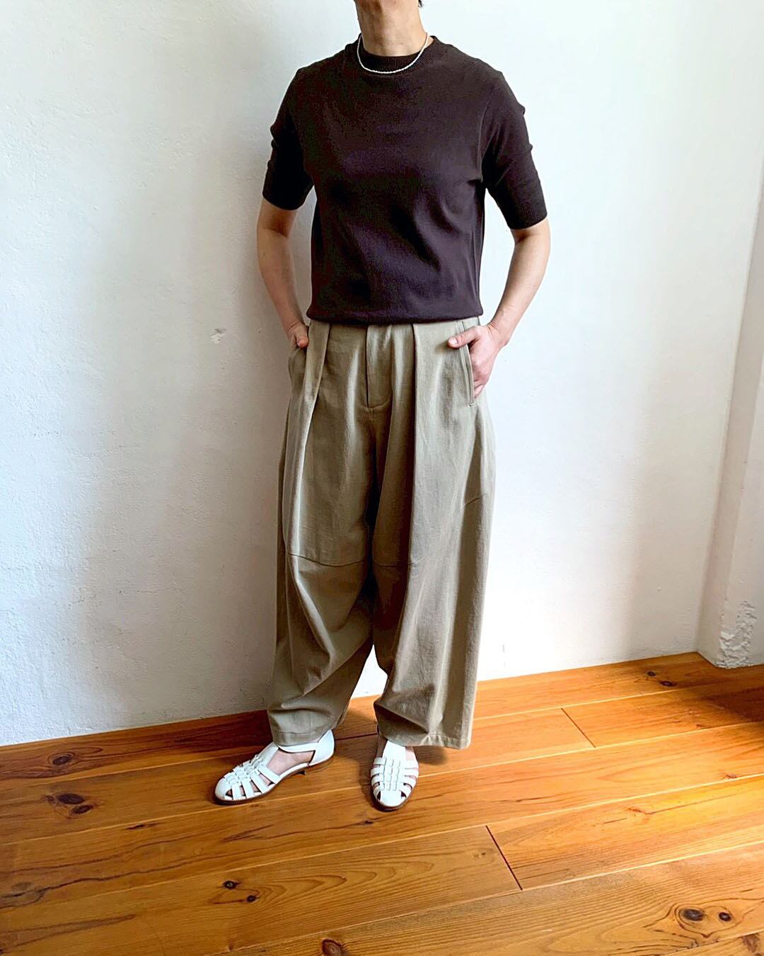 腰まわりのタックがほどよい奥行きを与え、リラックス感がありながらも、計算された立体美です。