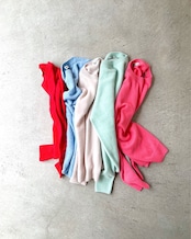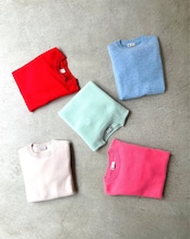 首元の開きのコンパクトさ、袖と裾のリブの切り替えもポイントになり、カジュアルからきれいめまで、合わせるボトムを選びません。