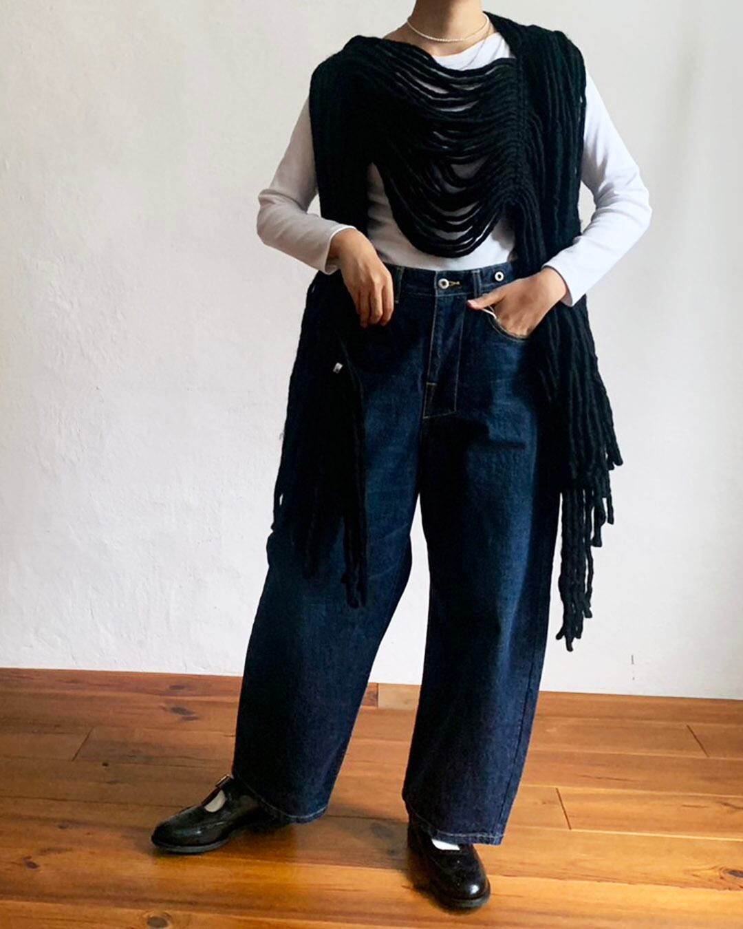 切り込みから腕を通してベストのようにも着られます。