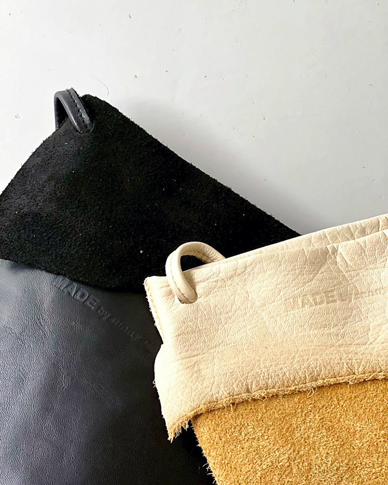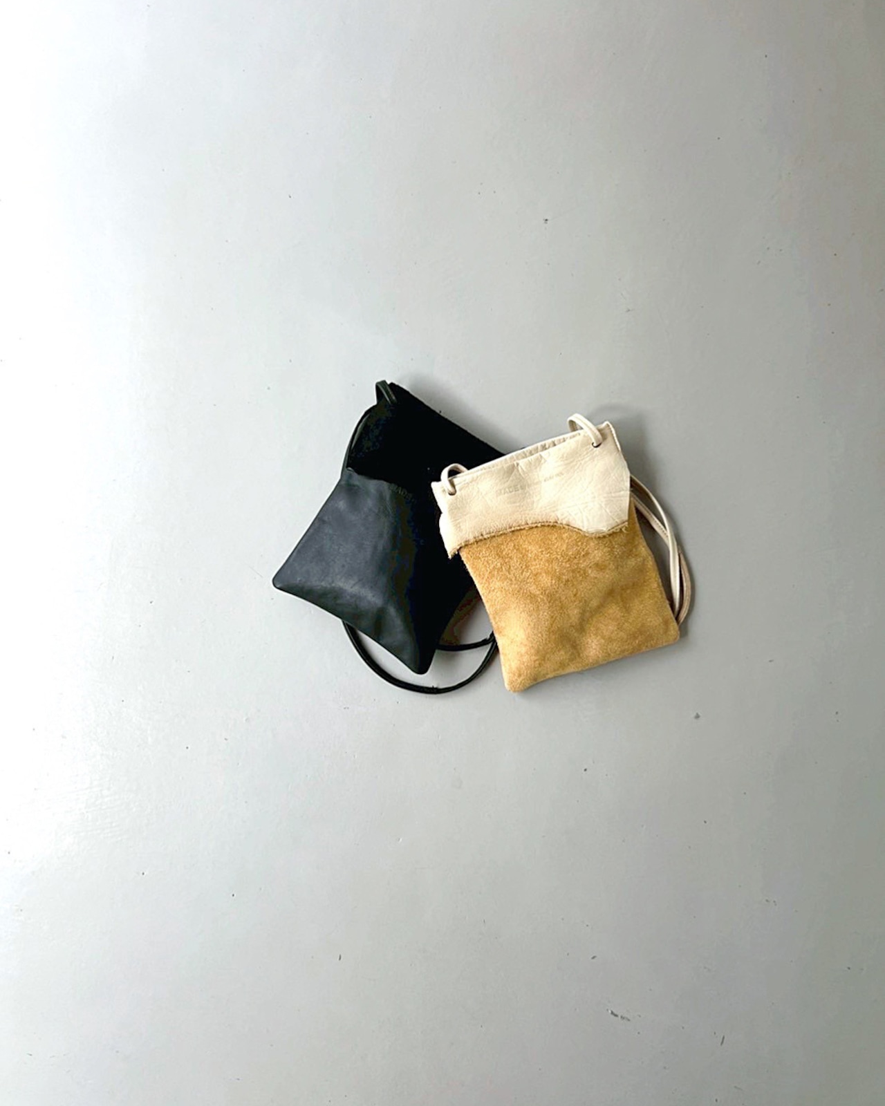作業中に出た革の端材を利用しており、ひとつひとつ違った表情と「SUNNY SIDE UP」の型押しが施されたシンプルでスタイリッシュなデザインです。