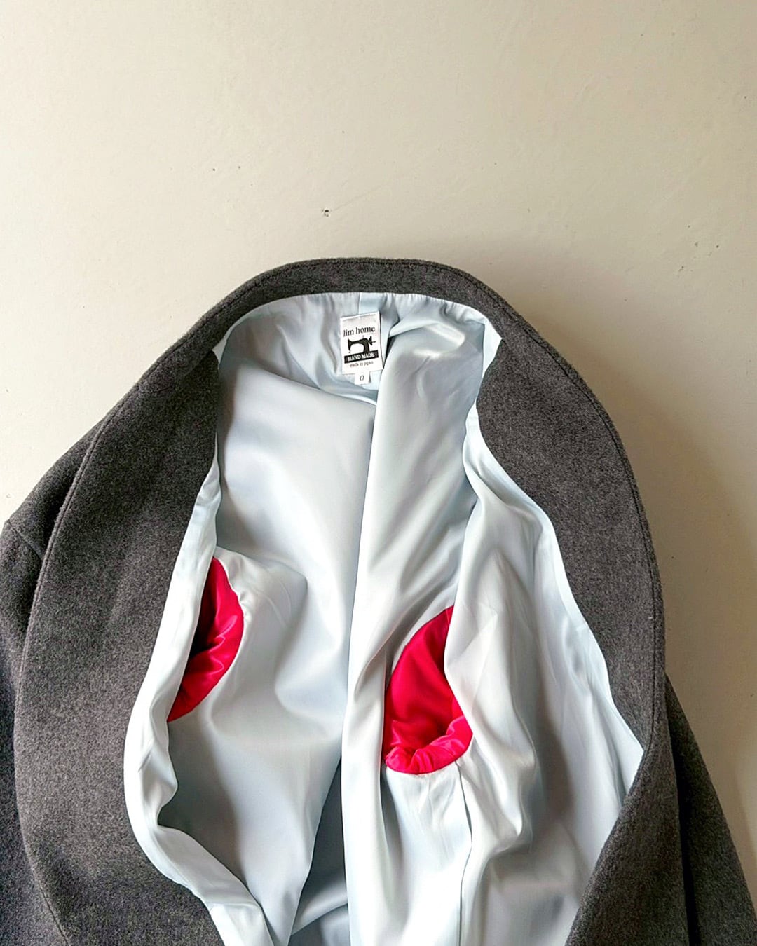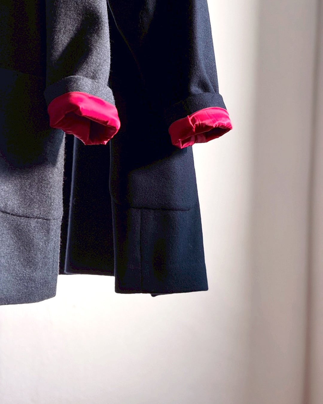 袖口を軽くロールアップすると、内側のピンクの裏地がふっとのぞき、落ち着いたトーンにささやかな変化をプラス。この小さなアクセントが、控えめながら上品なムードを引き立てます。