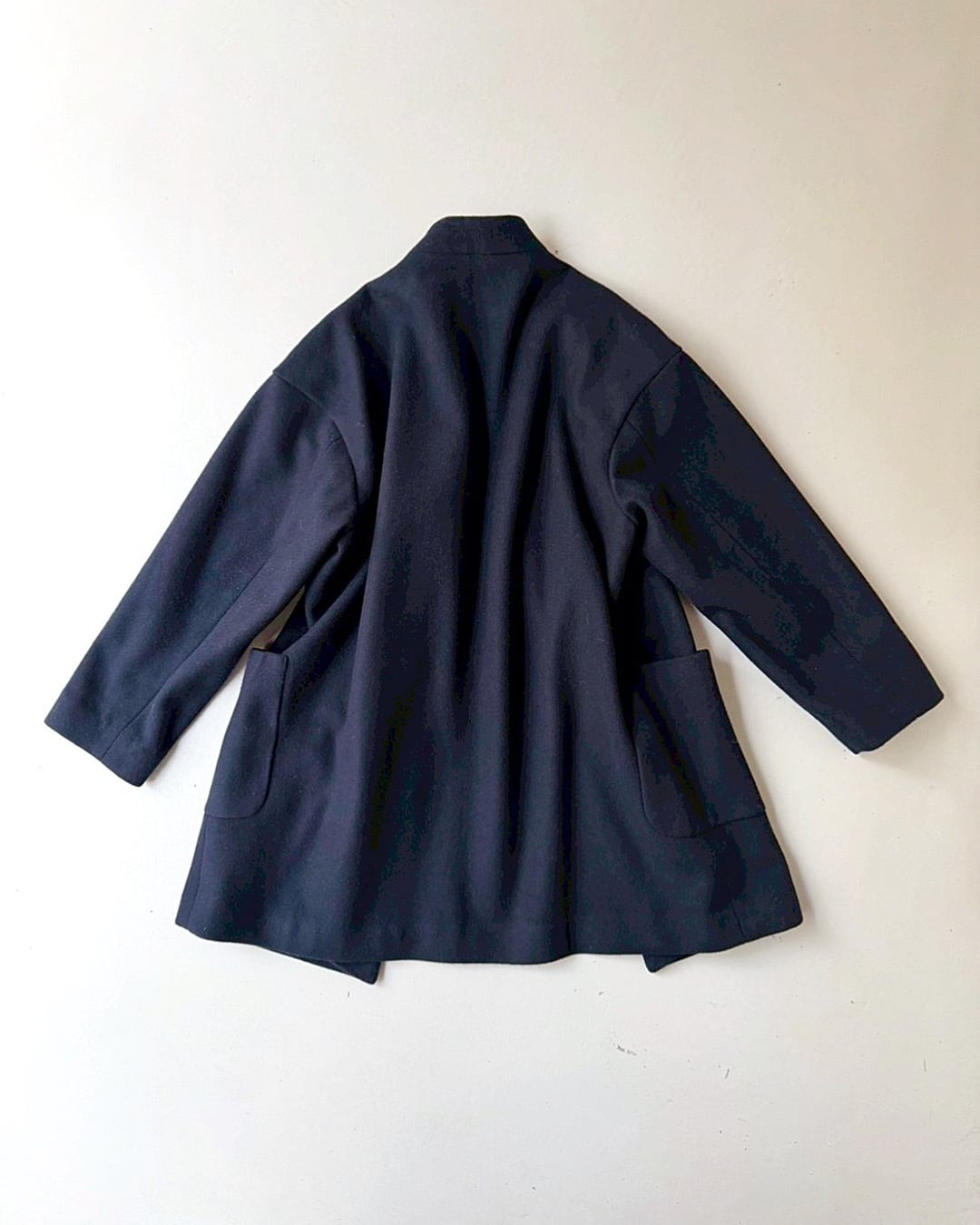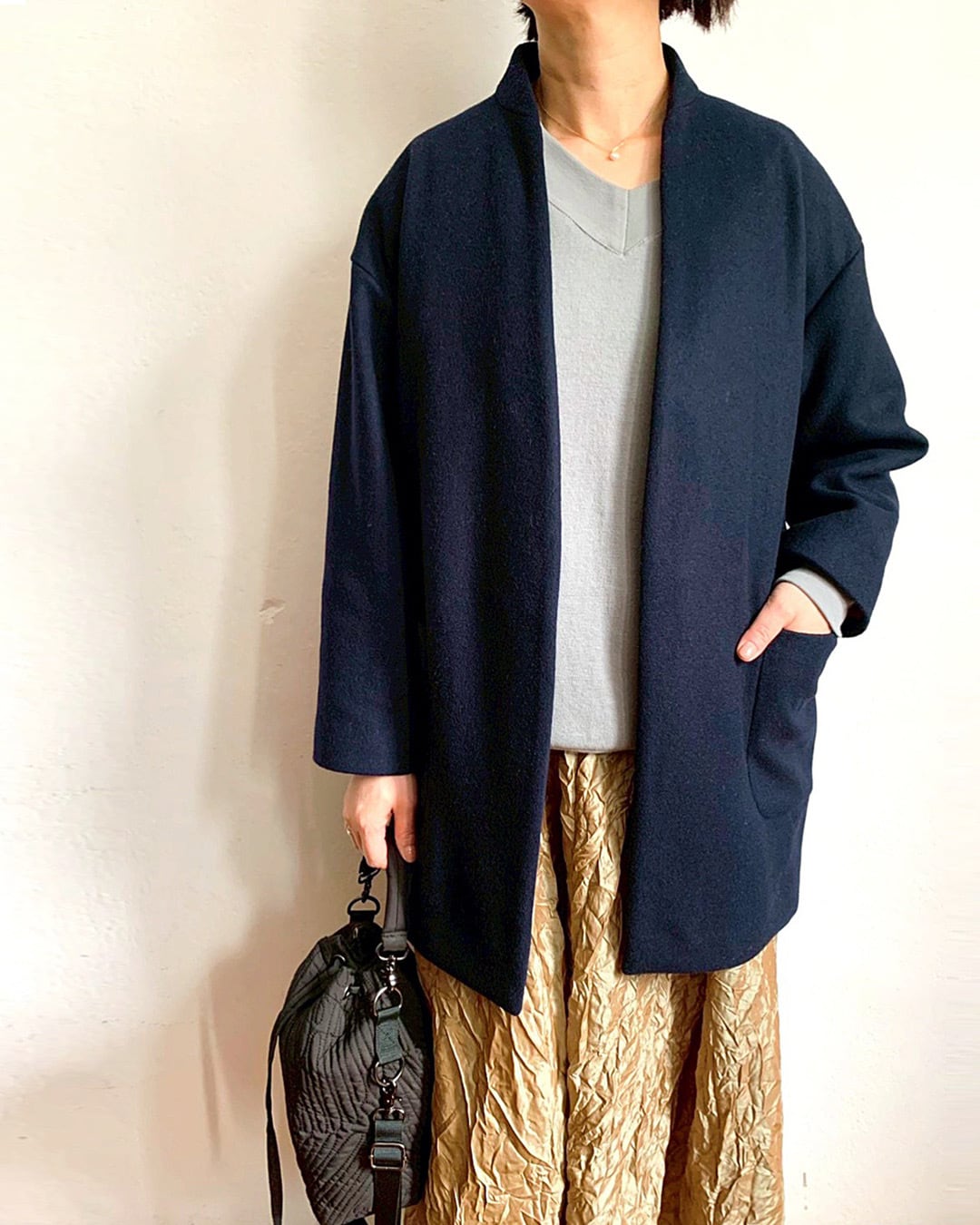 薄手で軽やかな着心地が魅力のノーカラーコート。