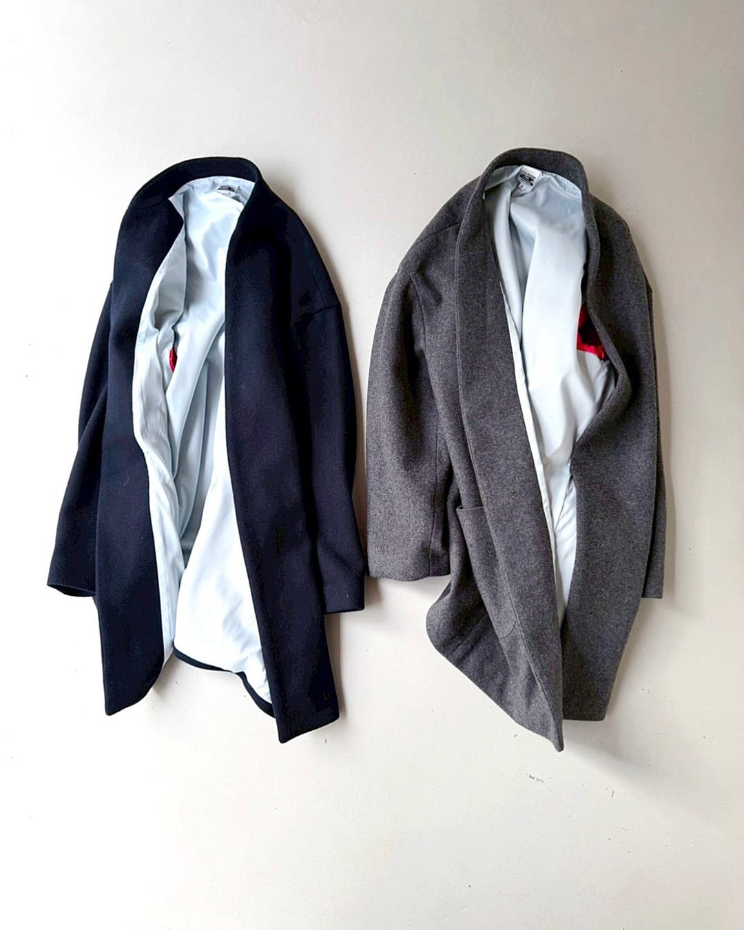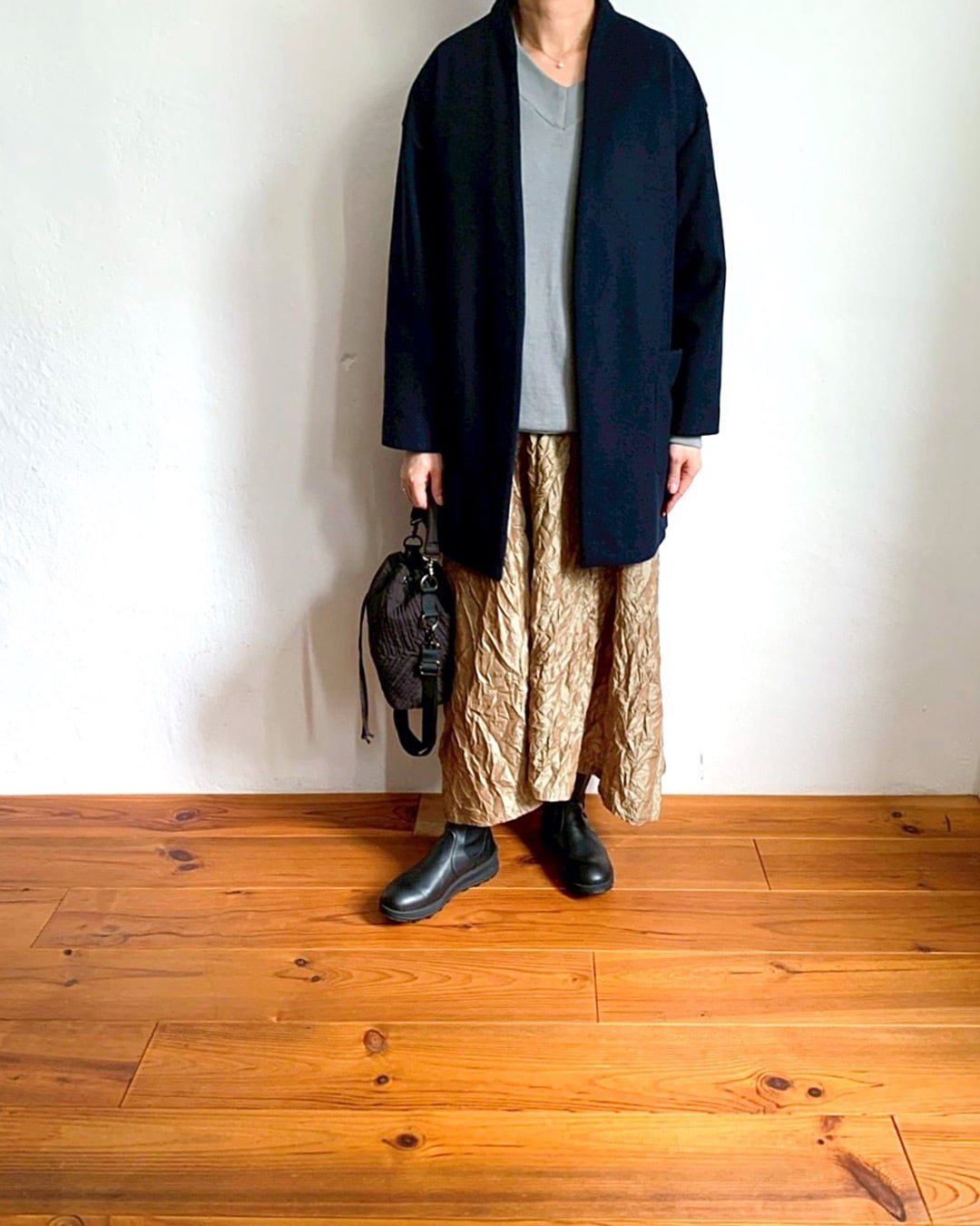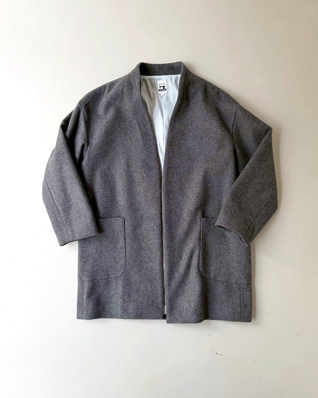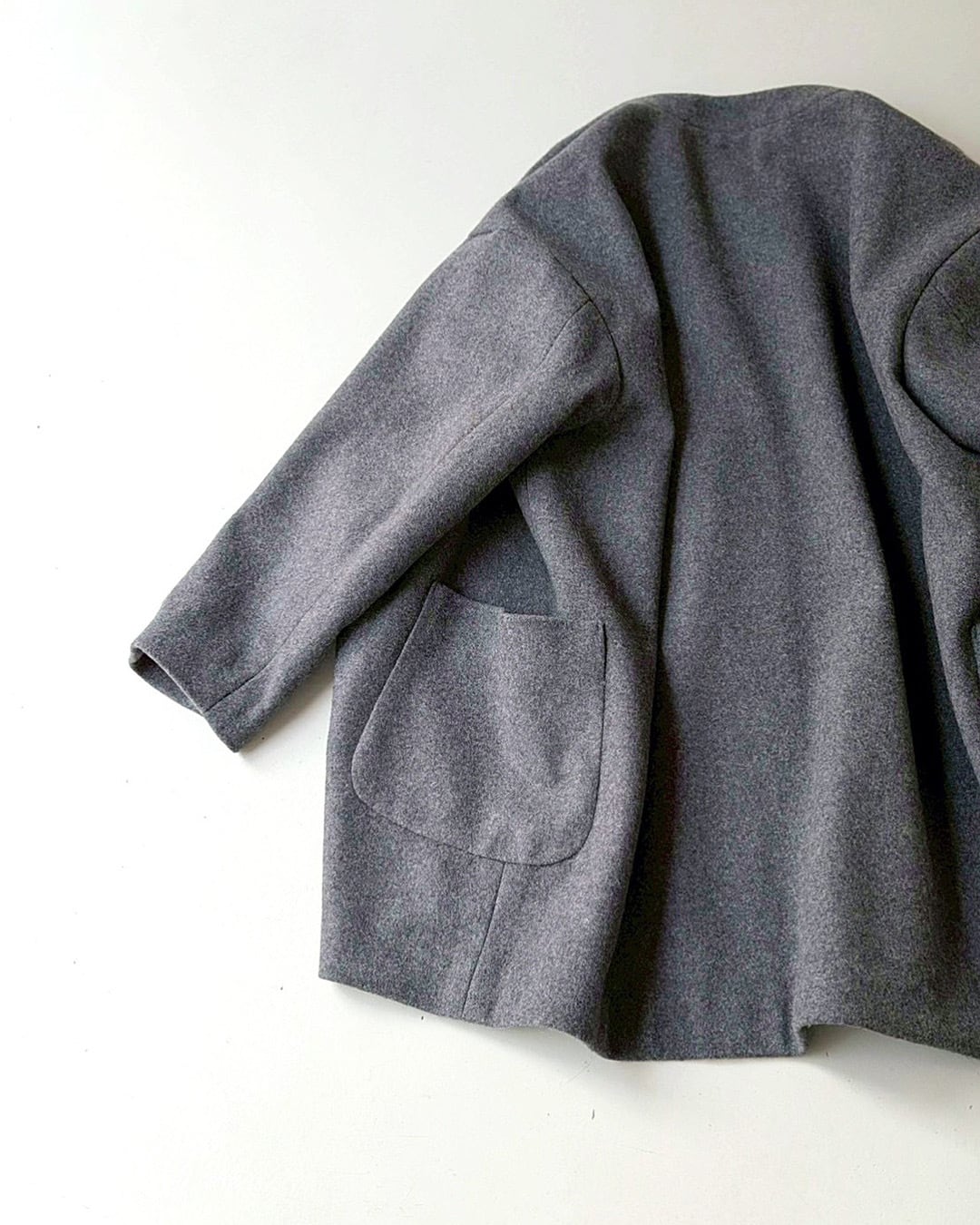 ボタンレスのミニマルなデザインに、やや大きめのポケットが柔らかな表情をプラスし、シンプルな中に洗練されたニュアンスが宿ります。