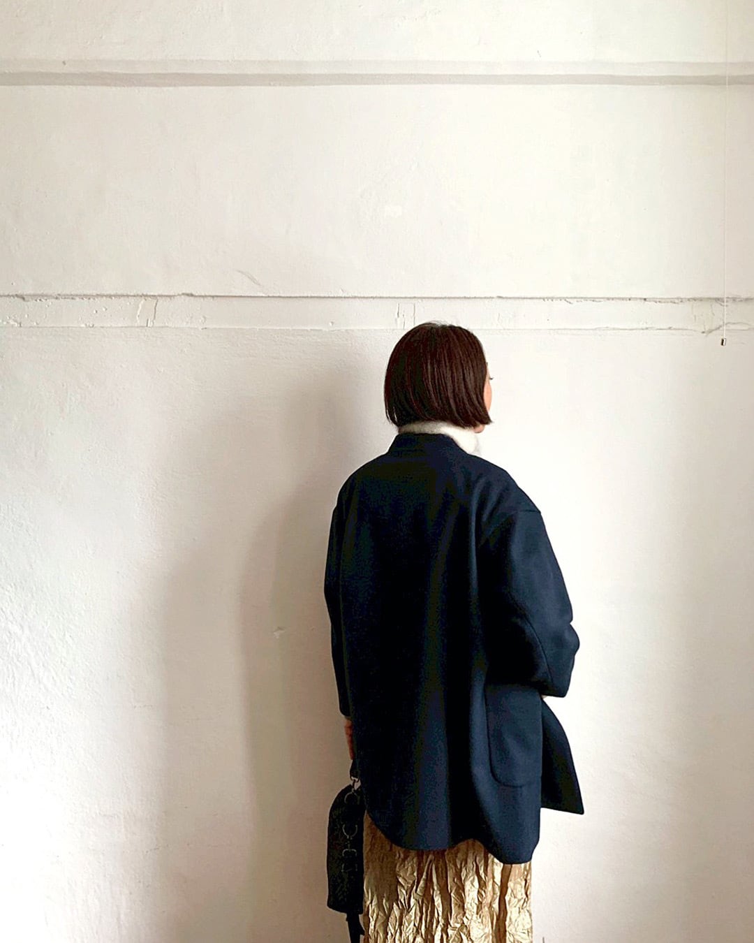 ヒップをカバーする絶妙な着丈と、装飾をそぎ落としたストレートなシルエットが、着こなし全体をすっきりと端正に整えます。