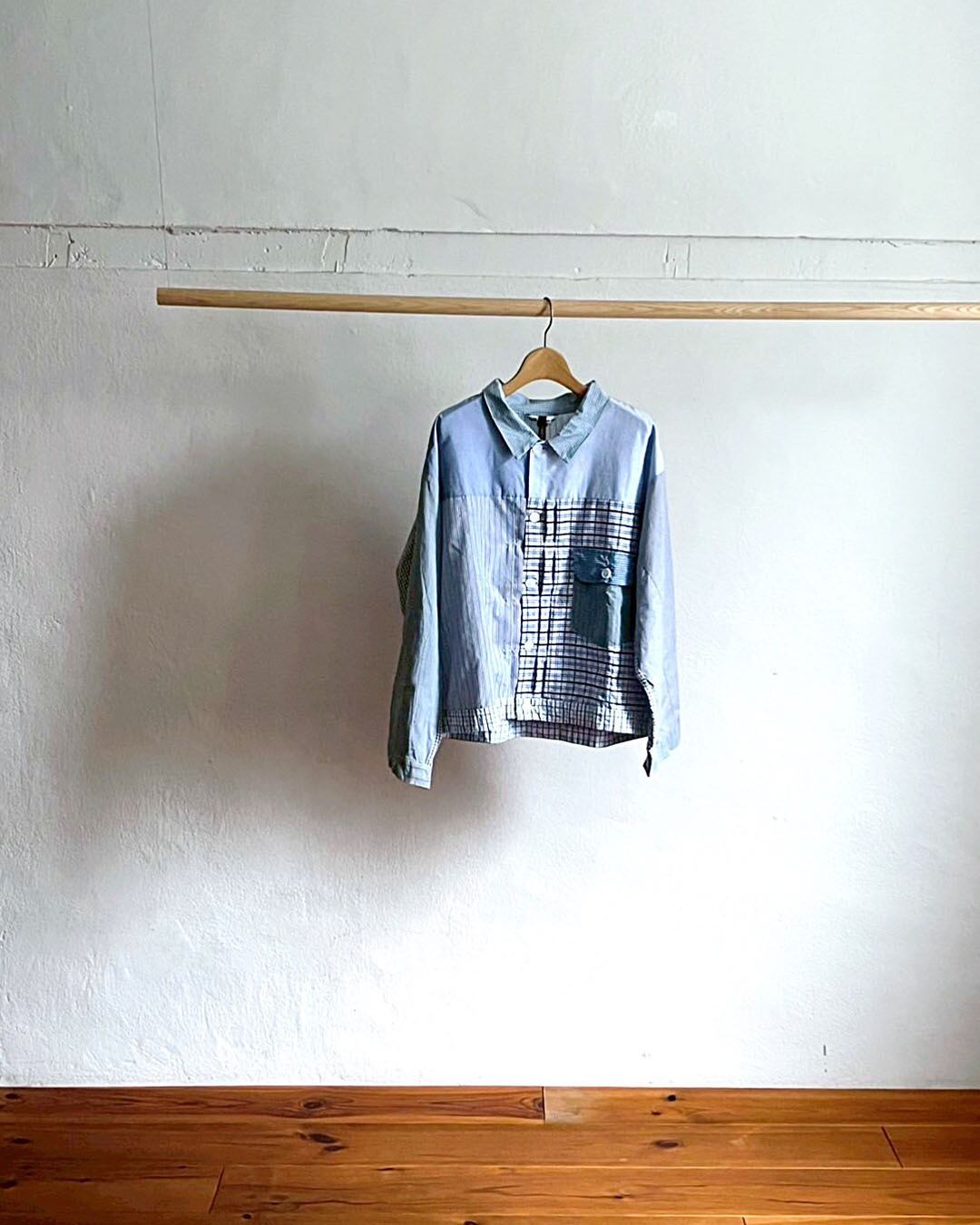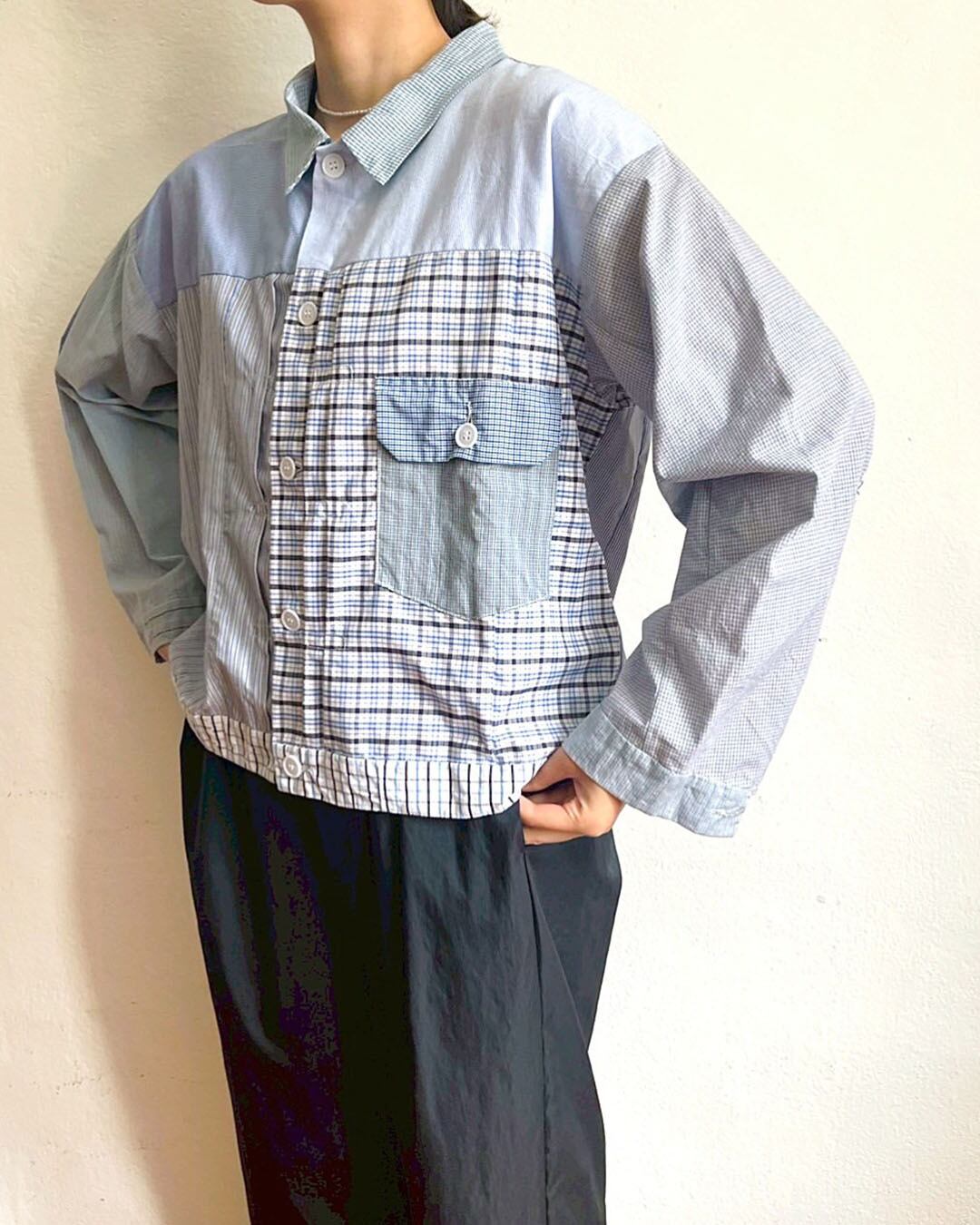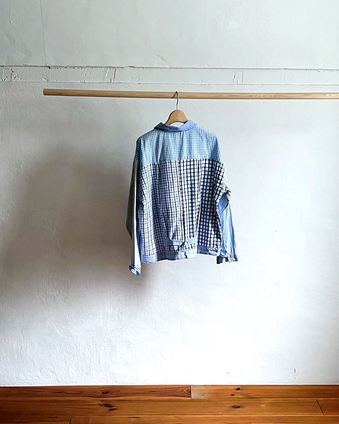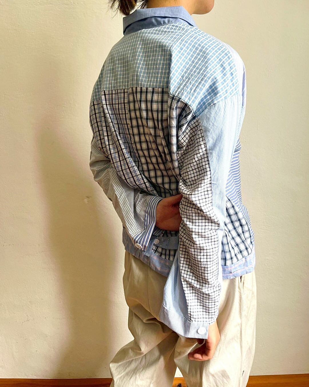 アメリカで買い付けたヴィンテージのチェックシャツを何枚も組み合わせて、パッチワークのように仕立てた一着。