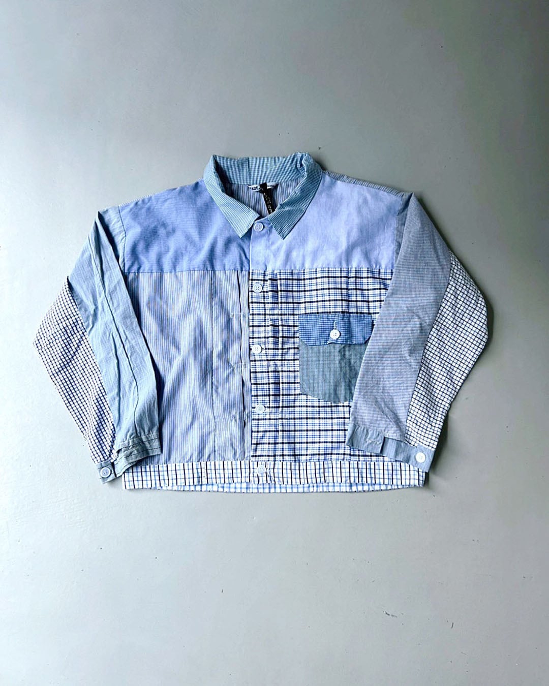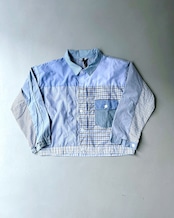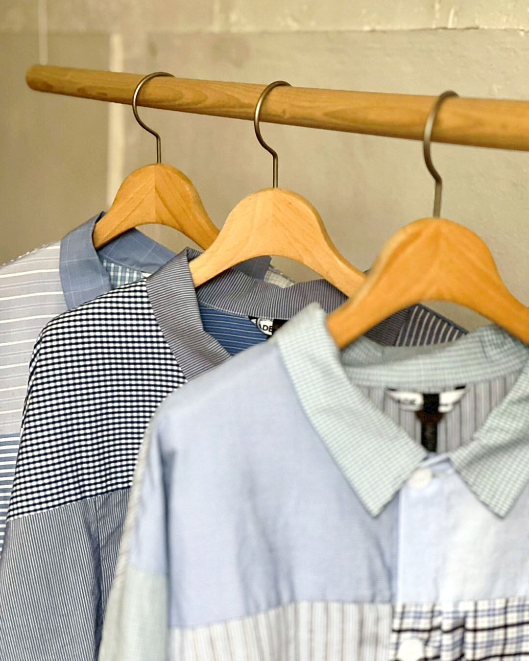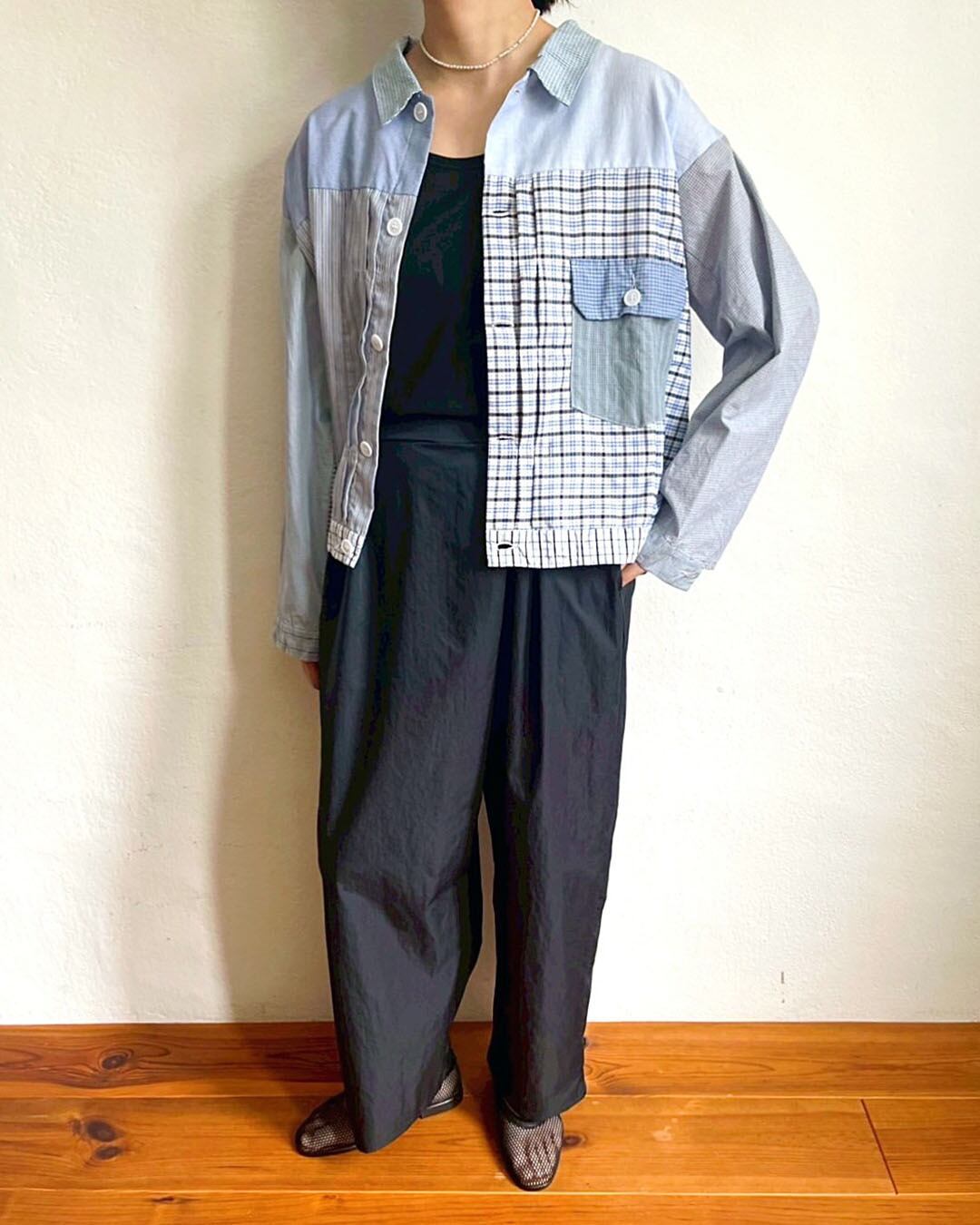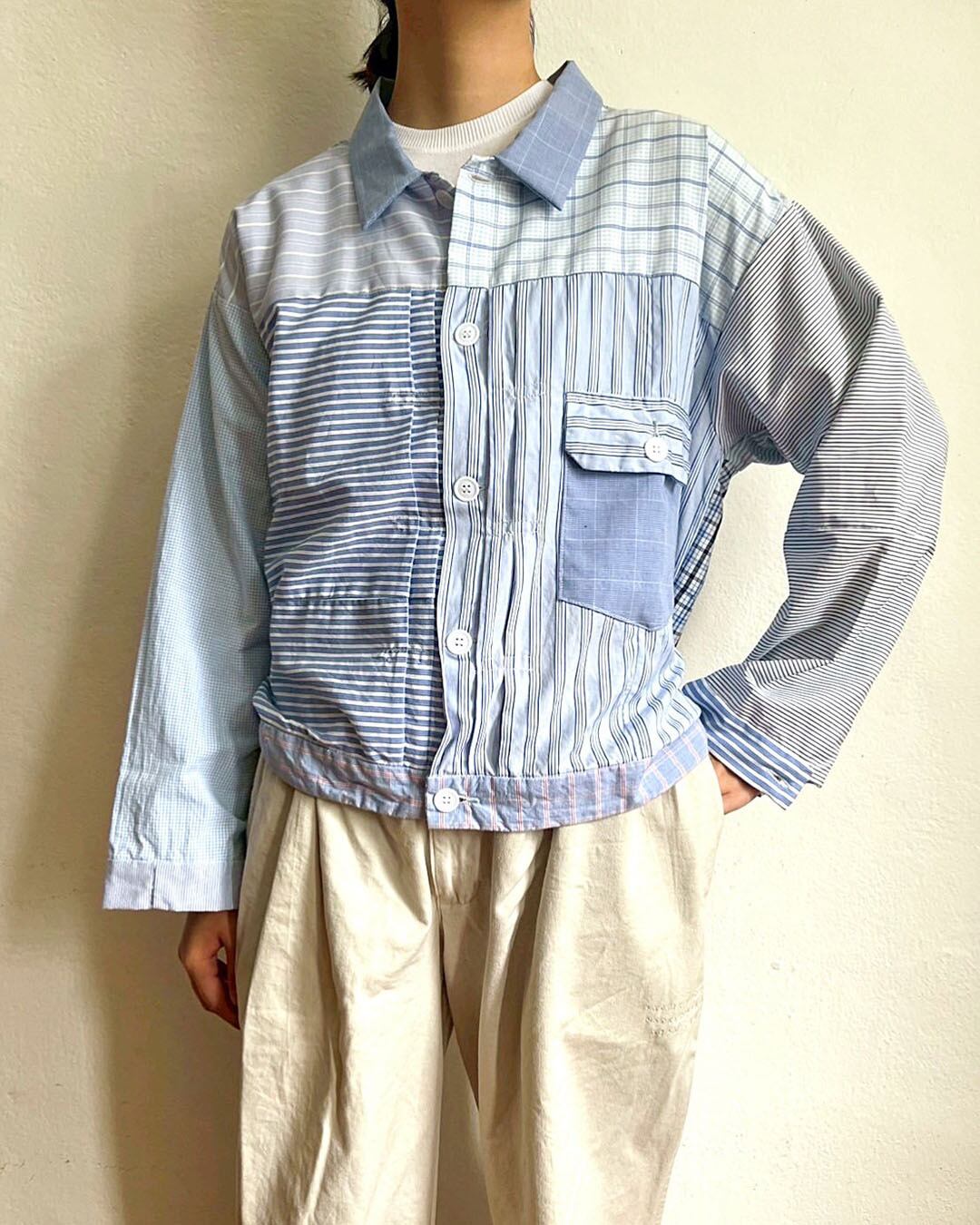 アメリカで買い付けたヴィンテージのチェックシャツを何枚も組み合わせて、パッチワークのように仕立てた一着。
