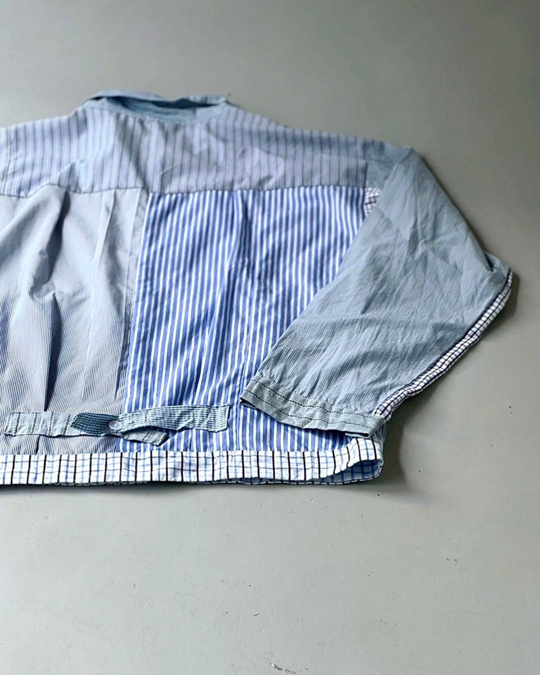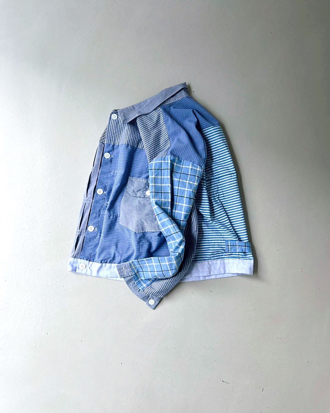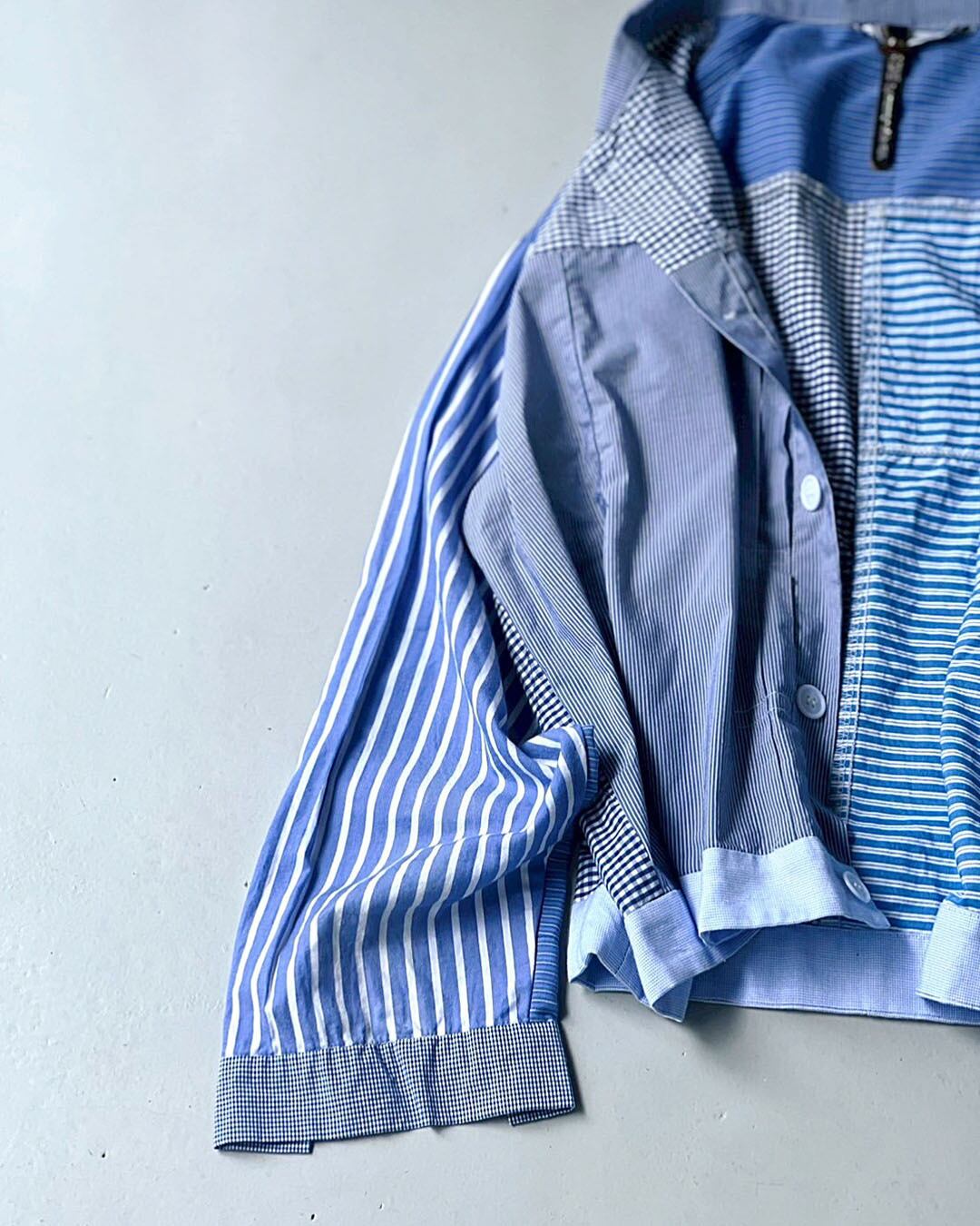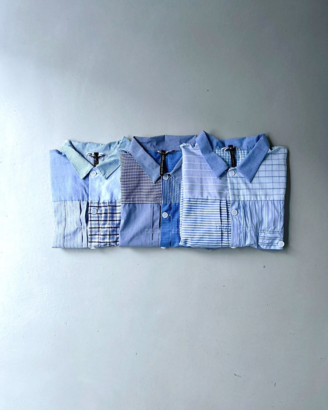 アメリカで買い付けたヴィンテージのチェックシャツを何枚も組み合わせて、パッチワークのように仕立てた一着。